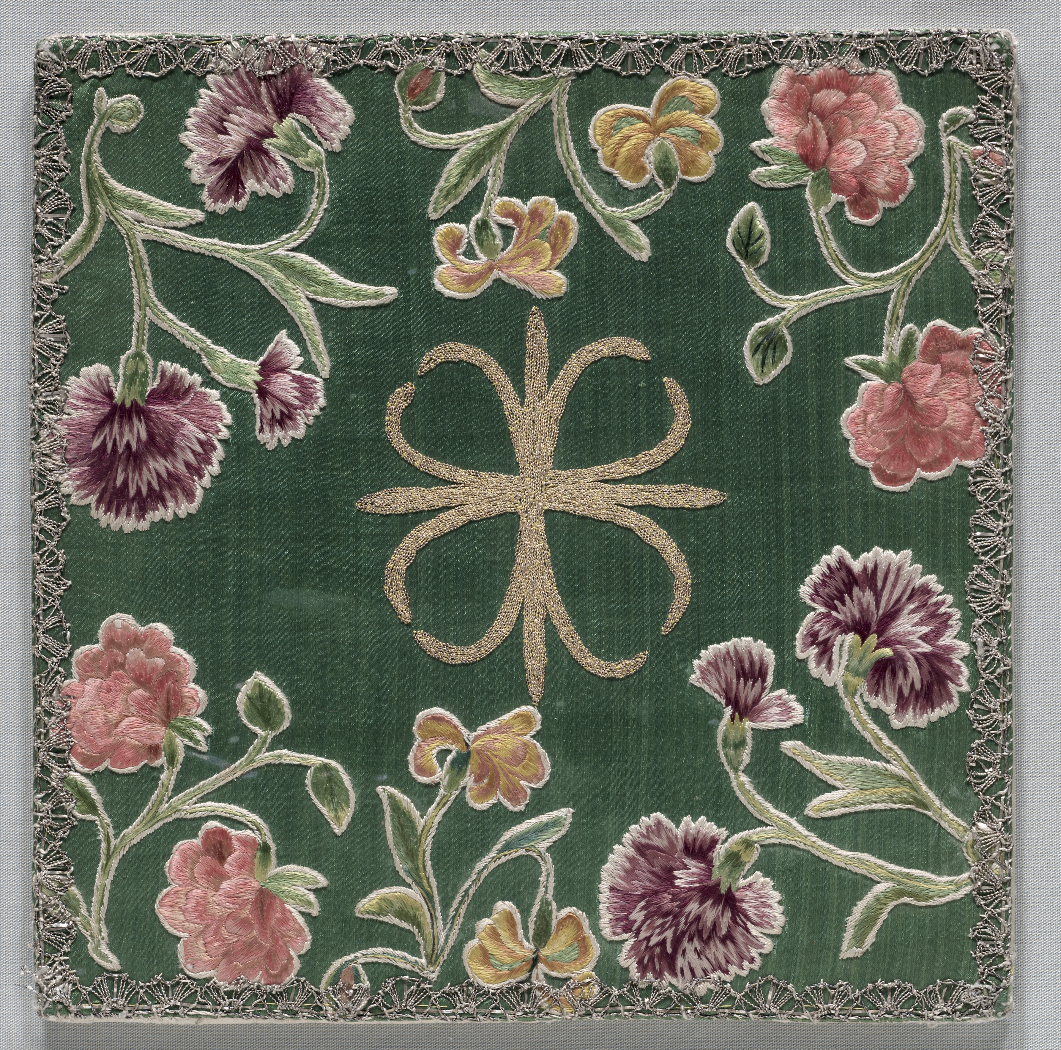 Green fabric with embroidered flowers and gold design. The fabric is square, dark green background with a decorative gold border around the edges. The border consists of a thin line of interlocking floral patterns. In the center of the fabric, there is a large gold embroidered design that resembles a flower or star with eight curved petals. Surrounding the central design are several embroidered flowers in shades of pink, purple, and yellow, with green stems and leaves. The flowers are scattered around the fabric, some with multiple blooms on a single stem. The flowers have a realistic appearance with detailed petals and shading. The overall design is symmetrical, with flowers and stems arranged in a balanced composition. The fabric appears to be a pouch for a chalice cover, likely used for religious purposes. The artist's work is characterized by intricate embroidery and attention to detail. The title of the work is "Pouch for the Chalice Cover".