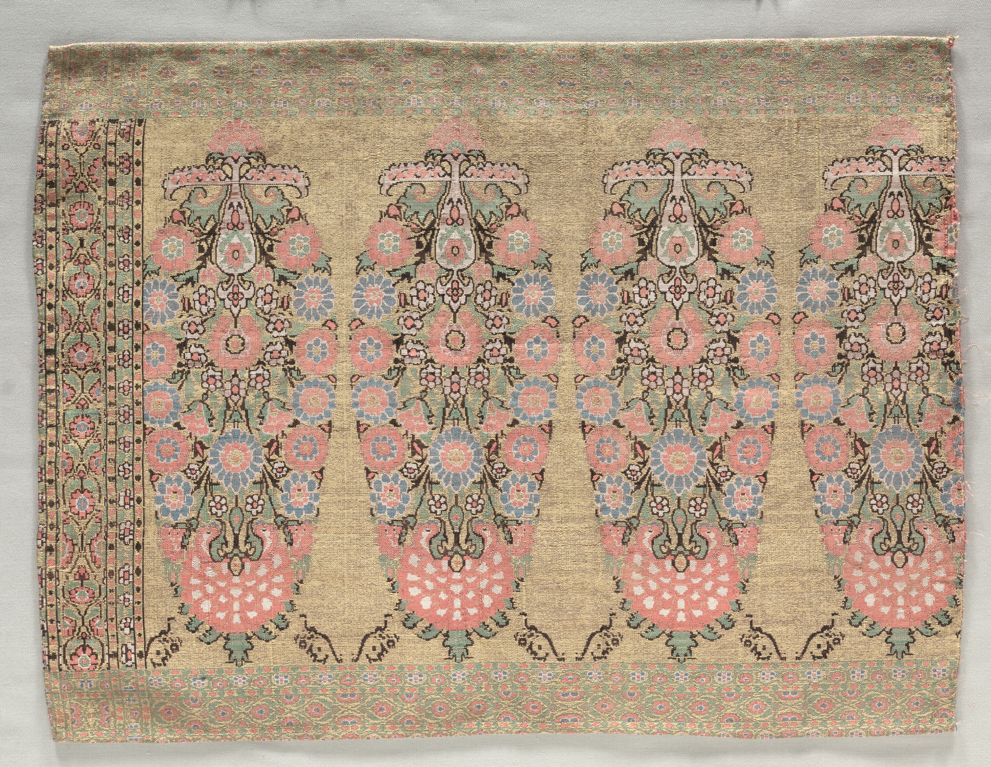 The image shows a rectangular piece of fabric with a repeating floral pattern. The fabric is beige with a border around the edges. The border at the top and bottom is green with pink and blue designs. The border on the left side is pink with green and black designs. The main body of the fabric has a repeating pattern of four identical floral designs. Each design features a pink base with blue, pink, and white flowers and green leaves. The background of the main body of the fabric is beige. The fabric appears to be a scarf, titled "Two Pieces from a Scarf" by an unknown artist.