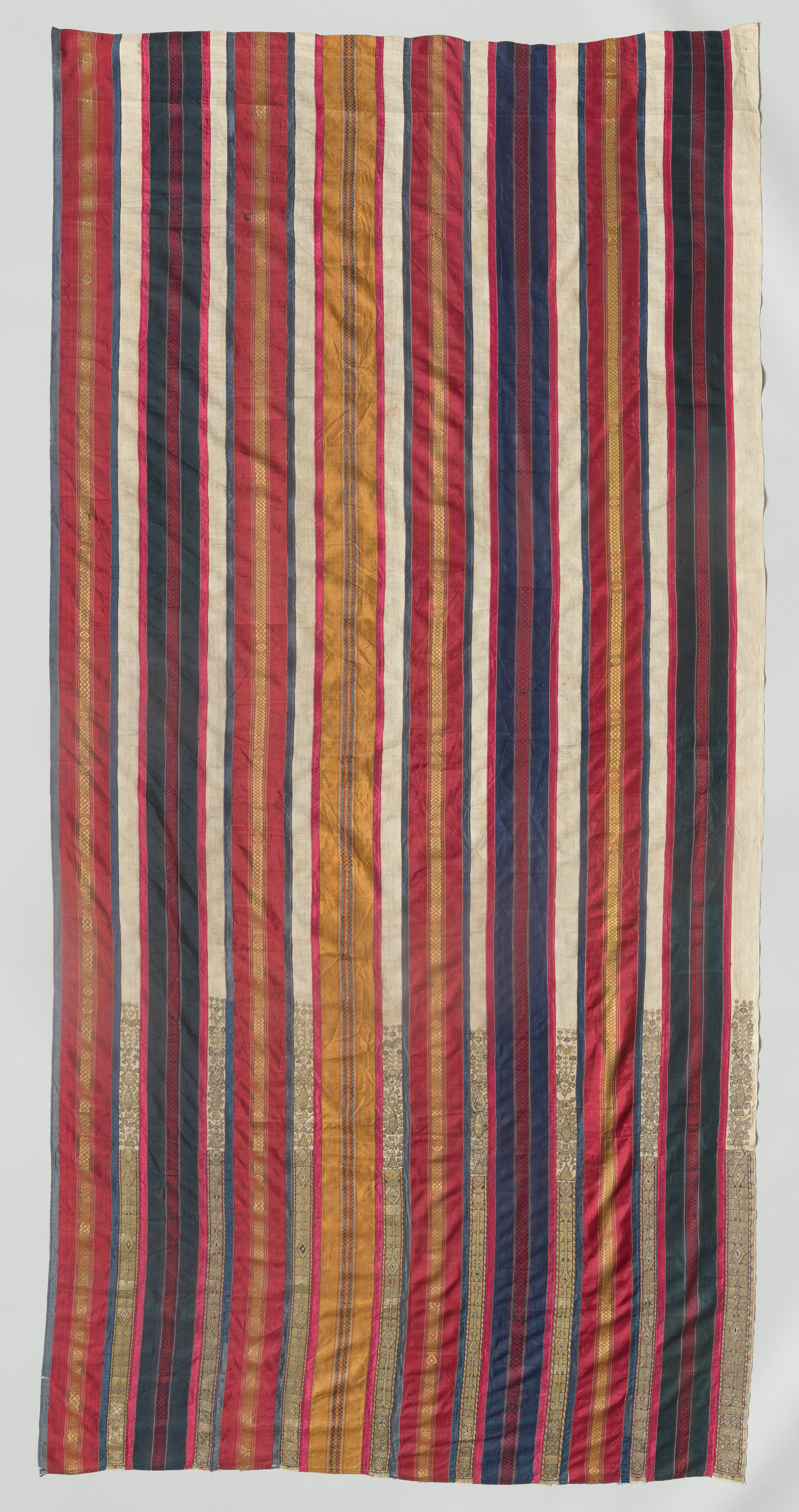 Curtain, one of a pair, made of fabric with vertical stripes in red, orange, dark blue, and white colors, with gold accents at the bottom. The fabric appears to be silk or a similar material, with a smooth texture and subtle sheen. The stripes are of varying widths, with some featuring intricate patterns and others being solid colors. The curtain has a plain white background.