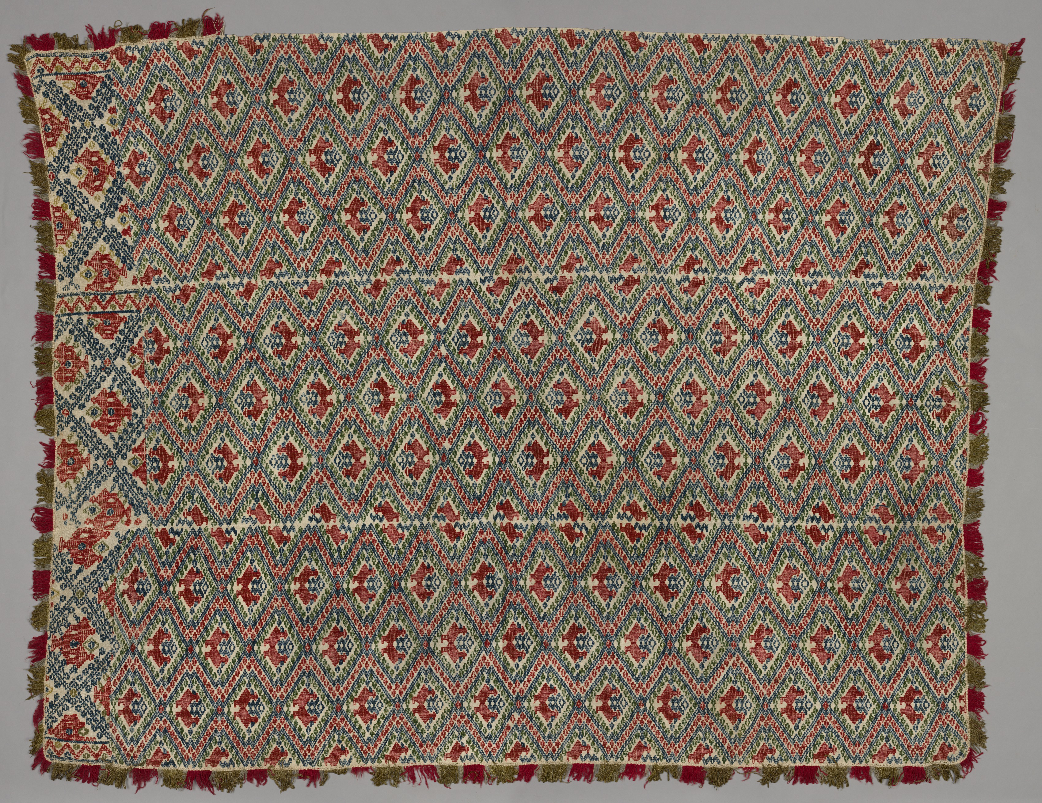 Rectangle with straight sides and rounded corners, covered in repeating diamond-shaped pattern. The diamonds are green with red and blue shapes inside. The background of the diamonds is cream-colored. Three horizontal lines cross the rectangle with no pattern. The edges are trimmed with green cord and red tassels. The title is "Bedspread". The artist is unknown.