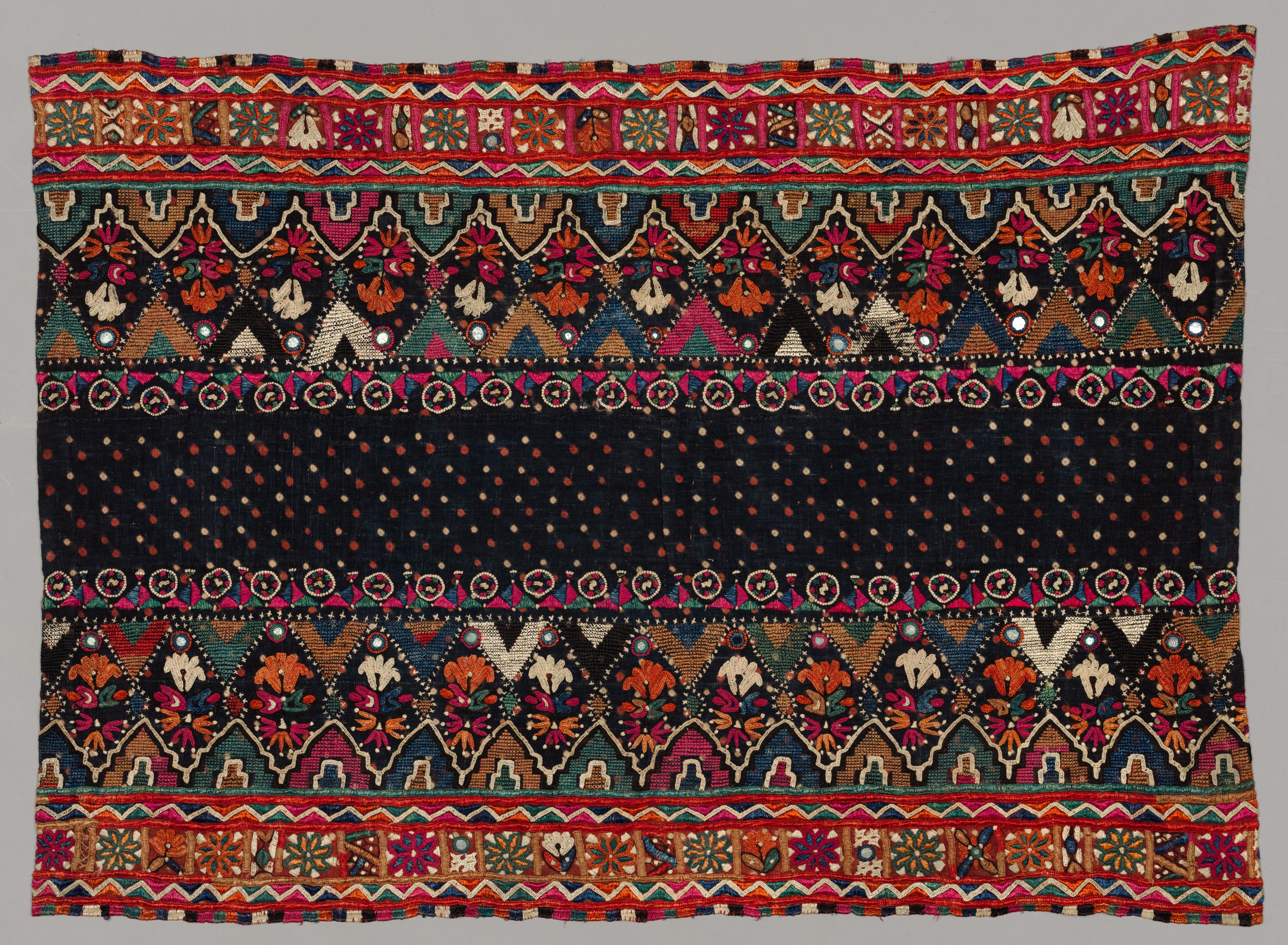Shawl by Unknown. The image features a rectangular textile with a black background. The top and bottom have horizontal bands of multicolored embroidery featuring zigzags, flowers and geometric shapes in shades of red, orange, blue, green and white. The center has two sections of black with small orange dots separated by a horizontal band of embroidery with diamonds and flowers in shades of orange, pink and green outlined in cream, on a black background. The second and fourth bands from the top feature an orange, pink and green design, outlined with cream on a black background. The bands towards the middle feature orange and pink flowers. The entire shawl showcases dense and intricate patterns throughout.