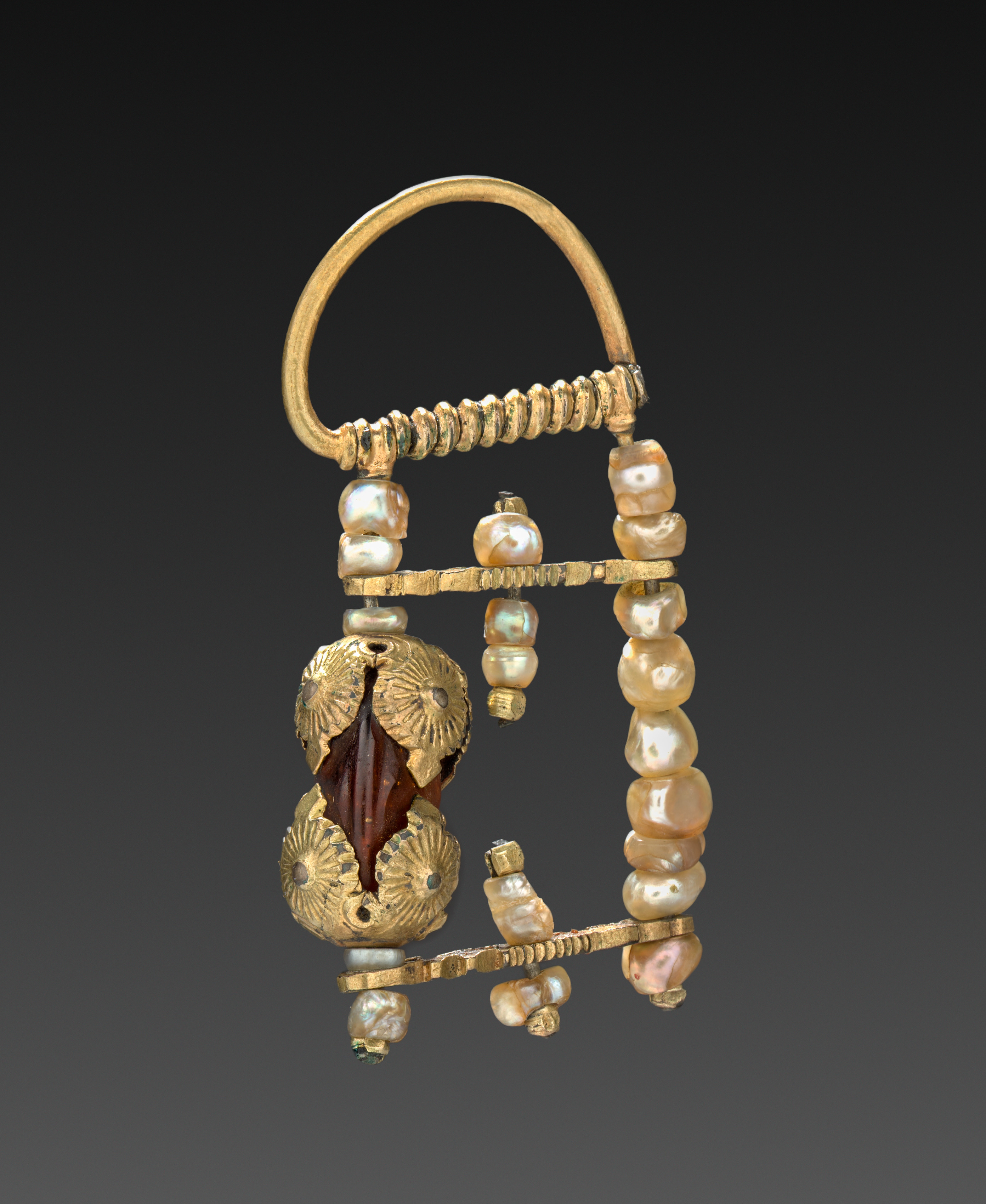 Gold earring with a loop at the top, featuring a coiled section below it. A horizontal gold bar extends from the coil on the right side, adorned with pearls of varying sizes. A second horizontal gold bar is positioned below the first, featuring a gold piece with a flower design in the center-left. A brown gemstone with a diamond shape is encased within the gold piece. A gold band connects to the bottom of the gold piece, extending to the right and then down, ending in a pearl. A single pearl hangs below on the left. The background is dark gray, transitioning to black at the top.
