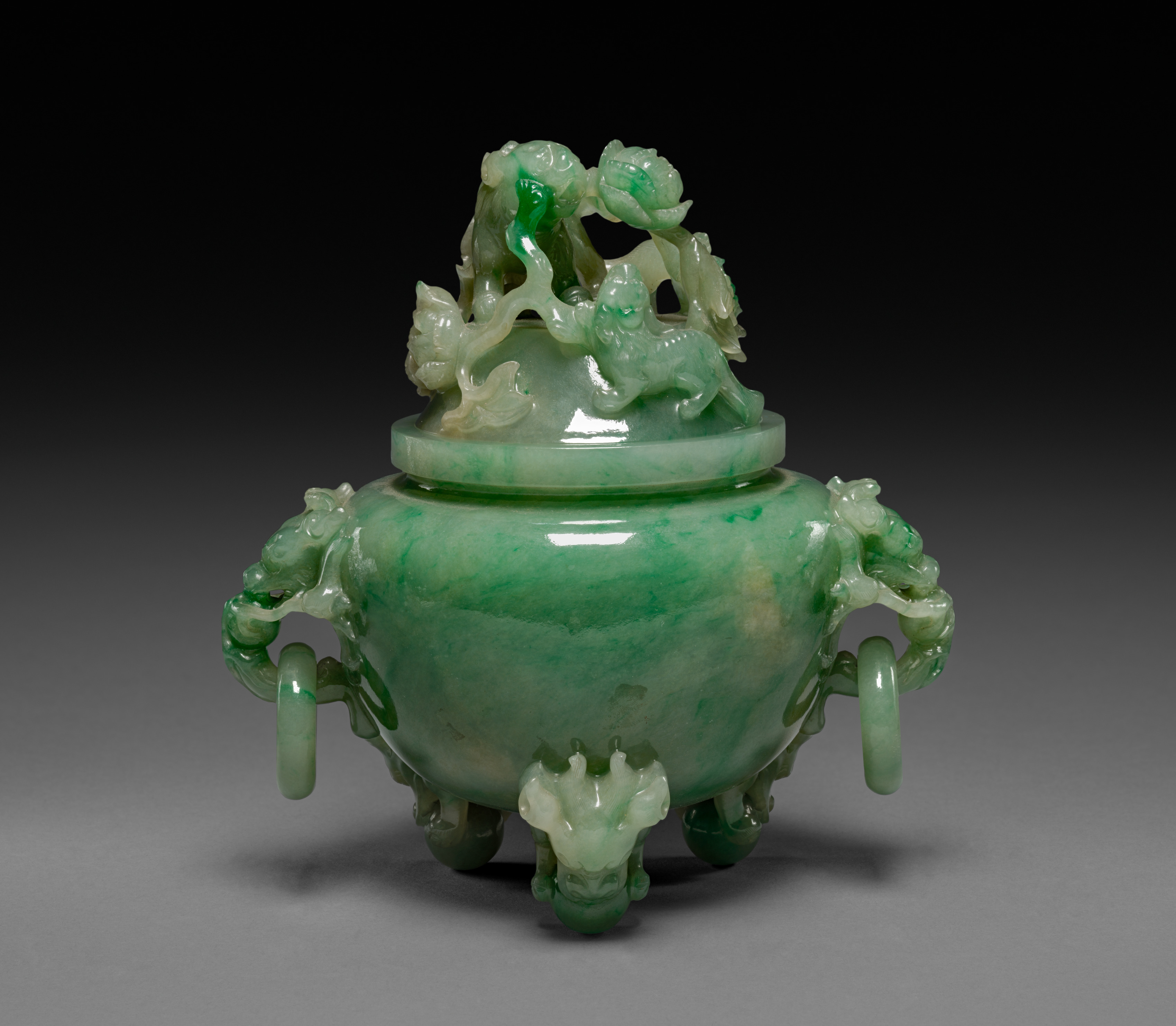 The Tripod Vase: Ting by artist is a green jade vase with a rounded body and three legs. The vase has two handles on either side, each featuring a dragon's head at the end. A lid sits atop the vase, adorned with carvings of animals and foliage. The vase itself features a mix of light and dark green hues, with a smooth, glossy finish. The background of the image transitions from black at the top to gray at the bottom.