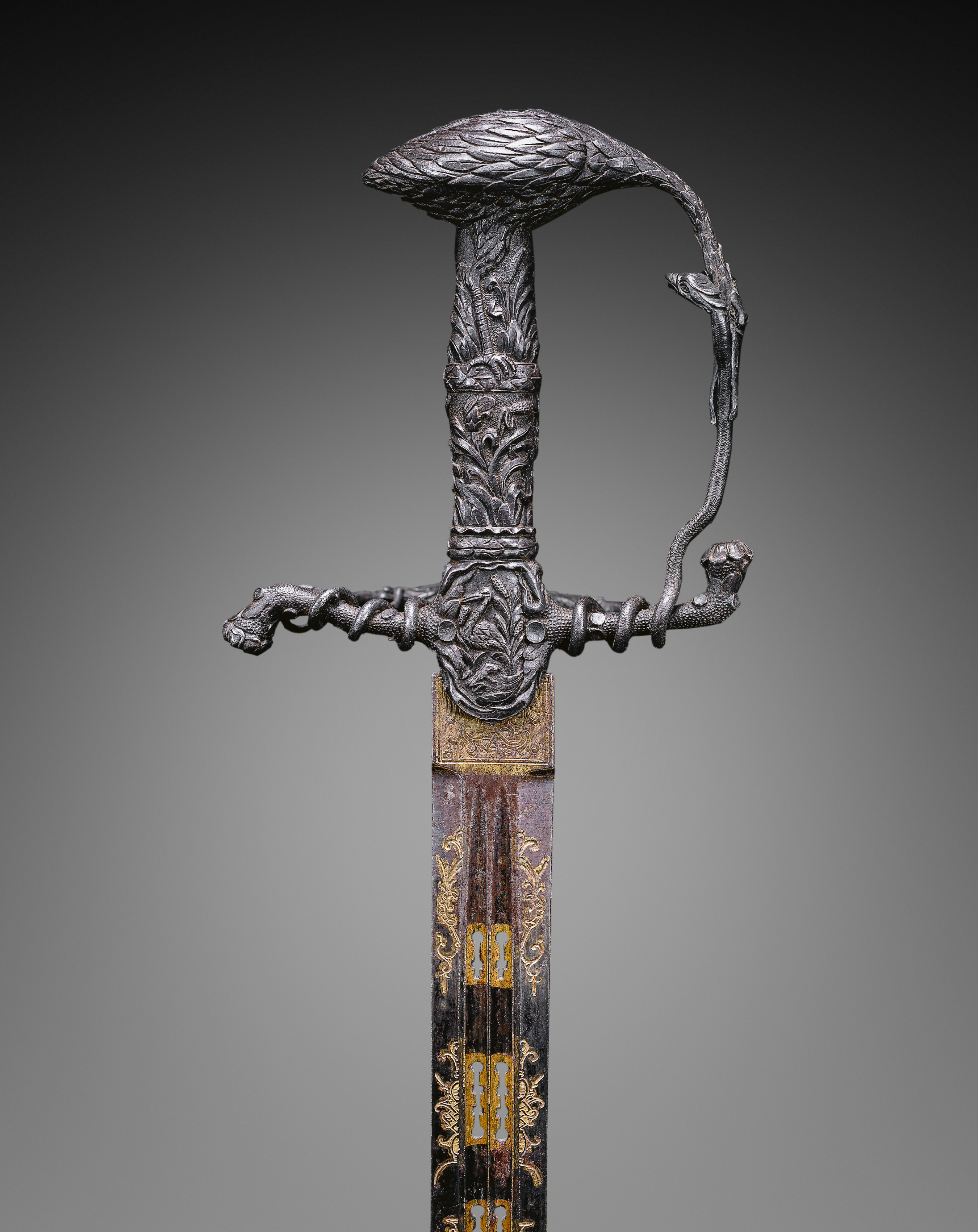 The Rapier by Metal sword hilt with intricately detailed handle, knuckle guard in the shape of two twisting animals; pommel in the shape of a shield; blade with gold floral pattern on a dark red and black background, rectangular shapes with gold frame.