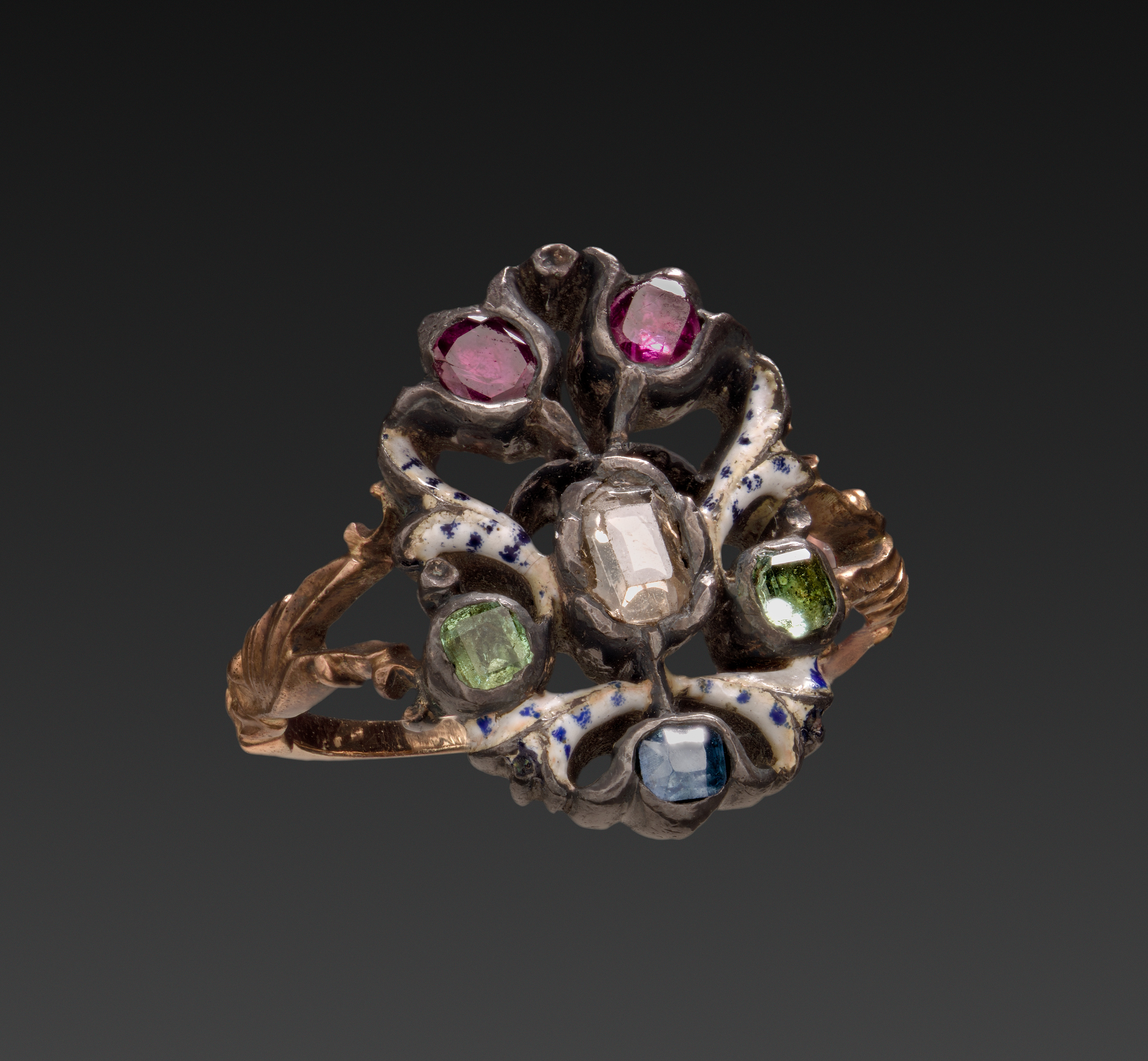 The image shows a ring titled "Ring" by an unidentified artist. The ring has a gold band with a white enamel inlay featuring blue dots. The band is thick and rounded, with a smooth surface. The ring's centerpiece features a white stone surrounded by six petal-like protrusions. The top two petals contain pink stones; the left and right protrusions below contain green stones; and the bottom center protrusion contains a blue stone. The stones are faceted and have a smooth surface. The background of the image is dark gray, gradually getting lighter towards the bottom.