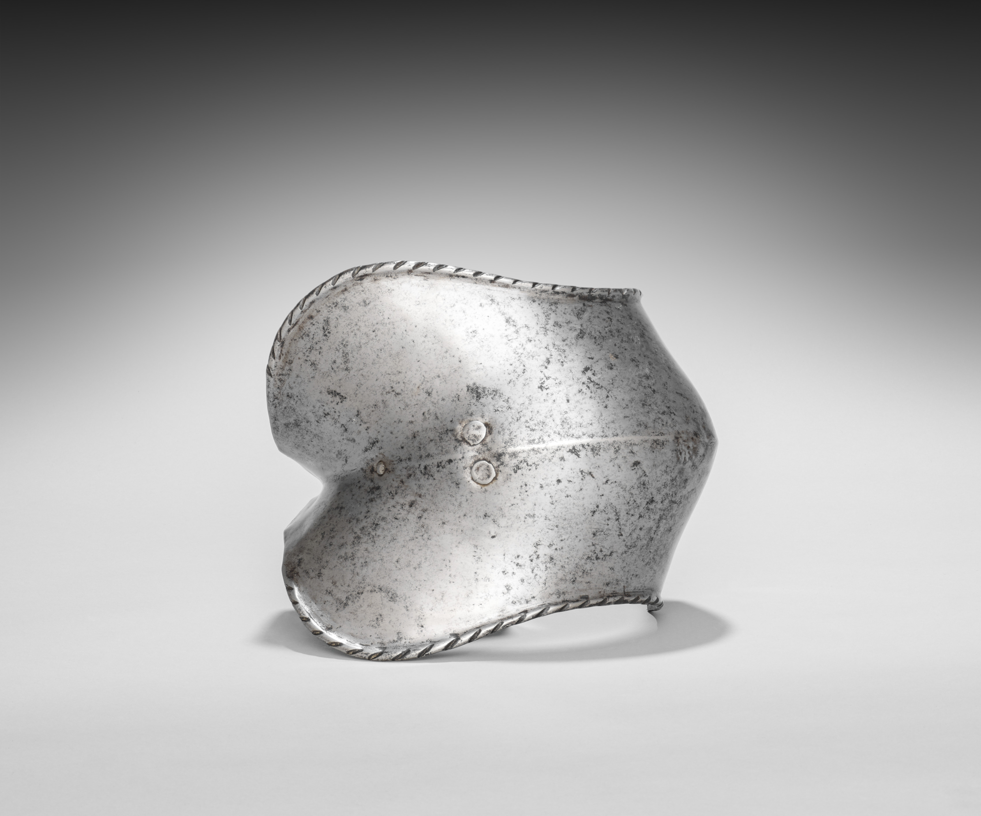 Elbow cop by artist, a metal piece resembling a protective elbow guard, made of silver-colored metal with a weathered appearance. The object features a rope-like edge around its perimeter. It has a central ridge line and two rivets. The piece is positioned at an angle, with the front facing slightly to the right. The background transitions from dark at the top to light gray towards the bottom, with the object casting a shadow.