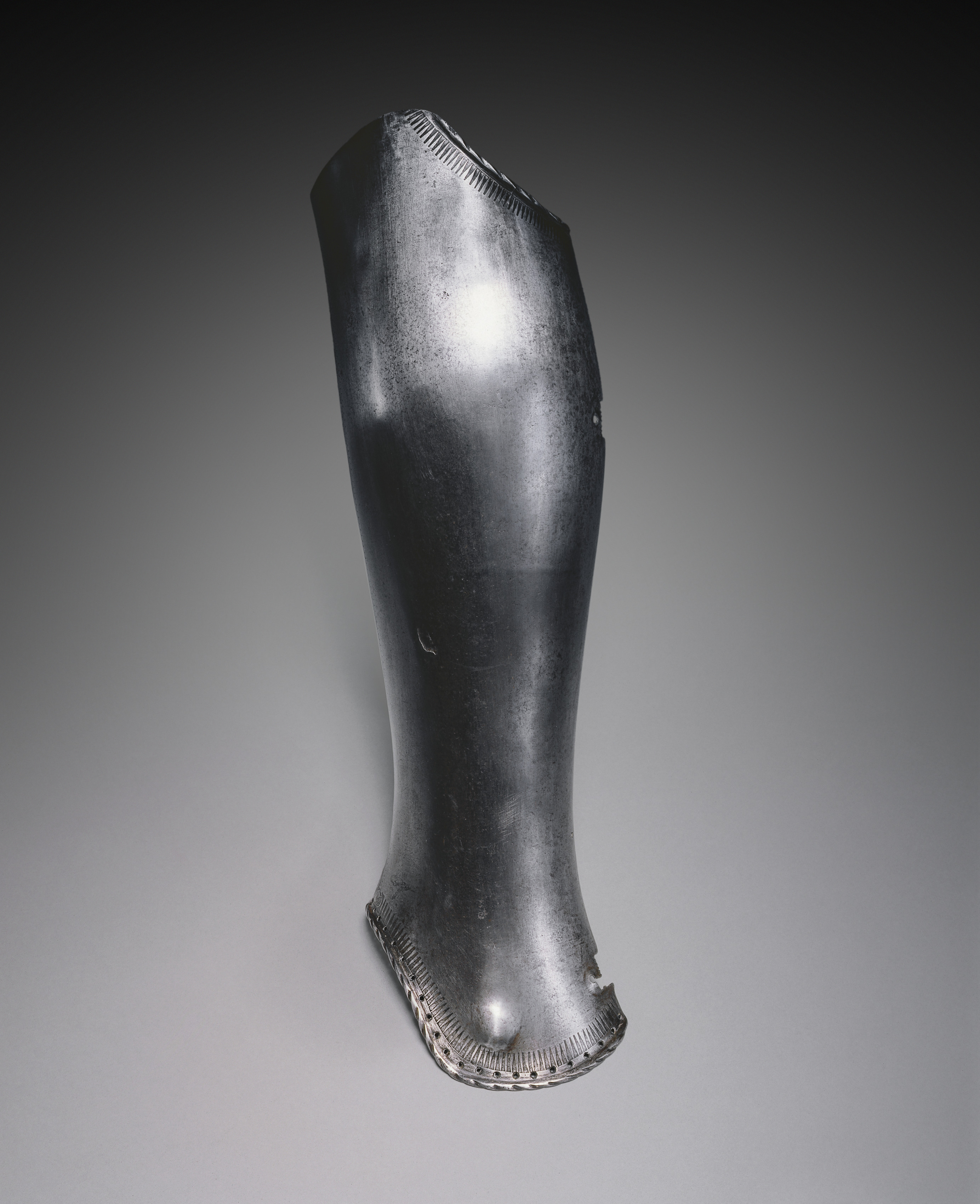 Metal leg guard, also known as a greave, made of silver or gray metal, with a shiny surface and visible wear and tear; the top is open and has a V-shaped cutout with a ribbed edge; the bottom has a flared edge with a ribbed design and small holes; the shape is curved to fit the leg, with a narrow top and a wider bottom; the background is a gradient from dark gray to light gray.