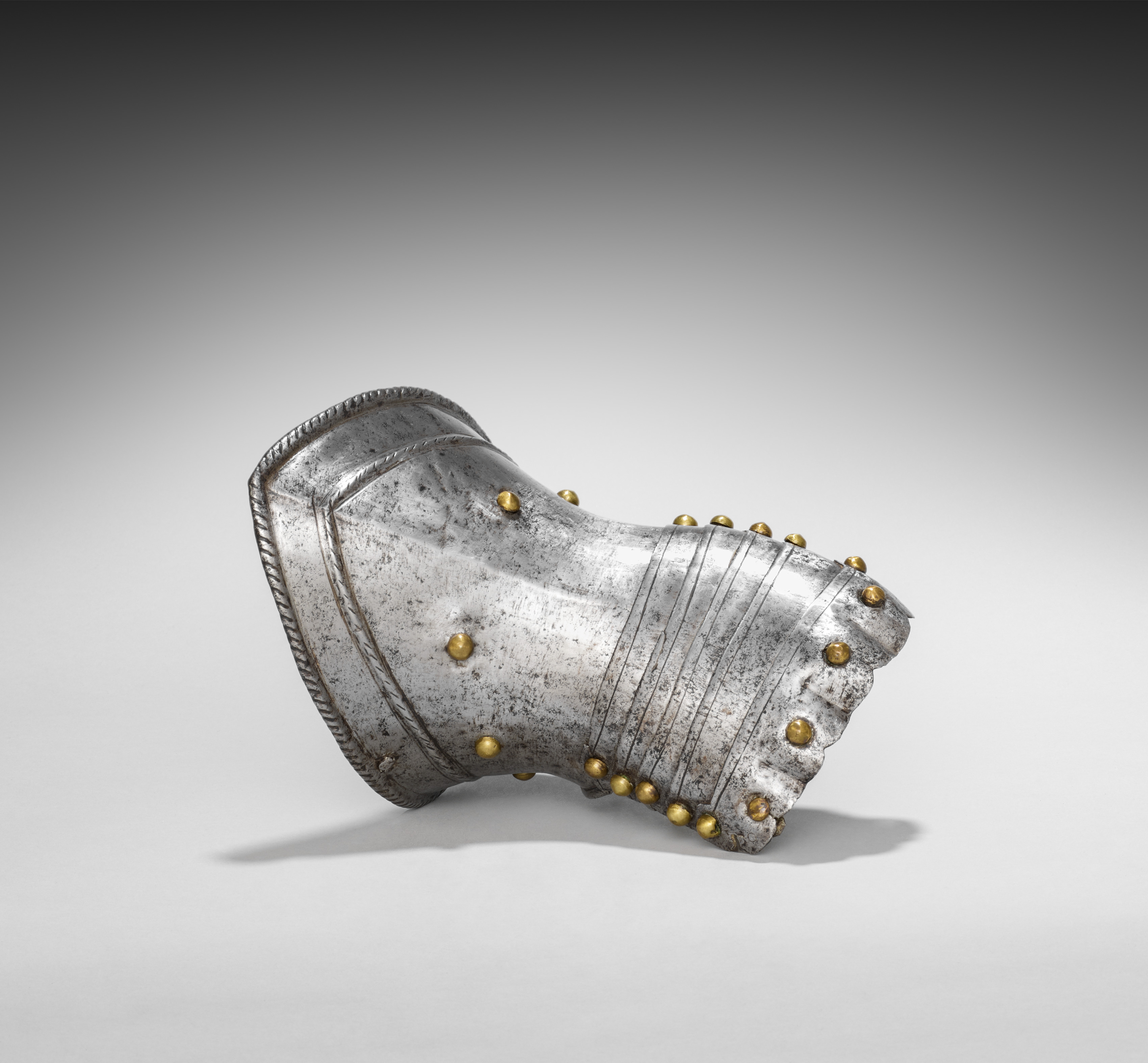 Metal gauntlet with a bell-shaped cuff on the right hand. The cuff is silver with a rope-like edge. There are several parallel grooves around the wrist area. The fingers and thumb are protected by raised sections with gold rivets around the edges. The background fades from dark to light gray.