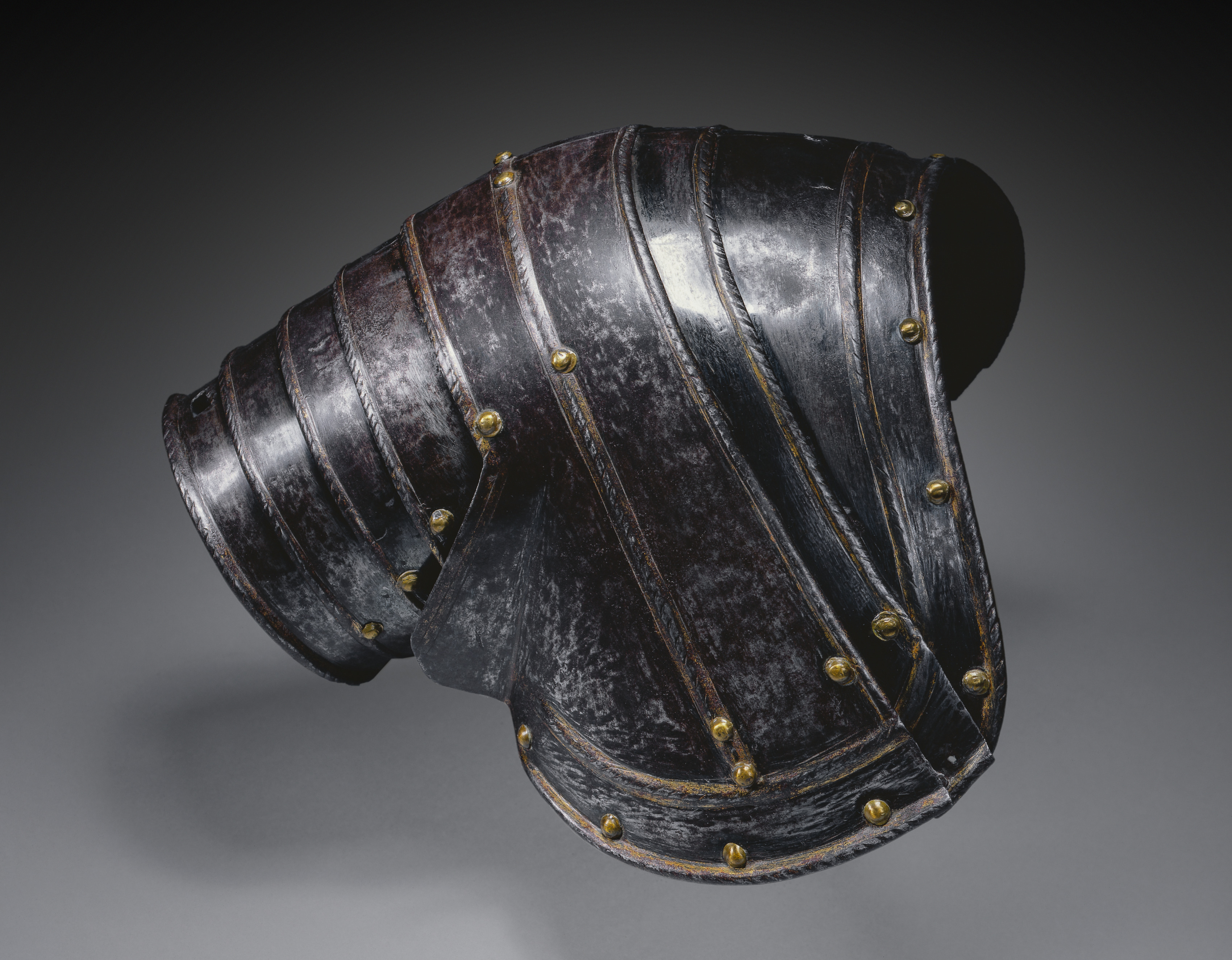 Black metal pauldron for right shoulder, made of multiple overlapping plates with ridged edges, secured by brass rivets, on a gray gradient background.