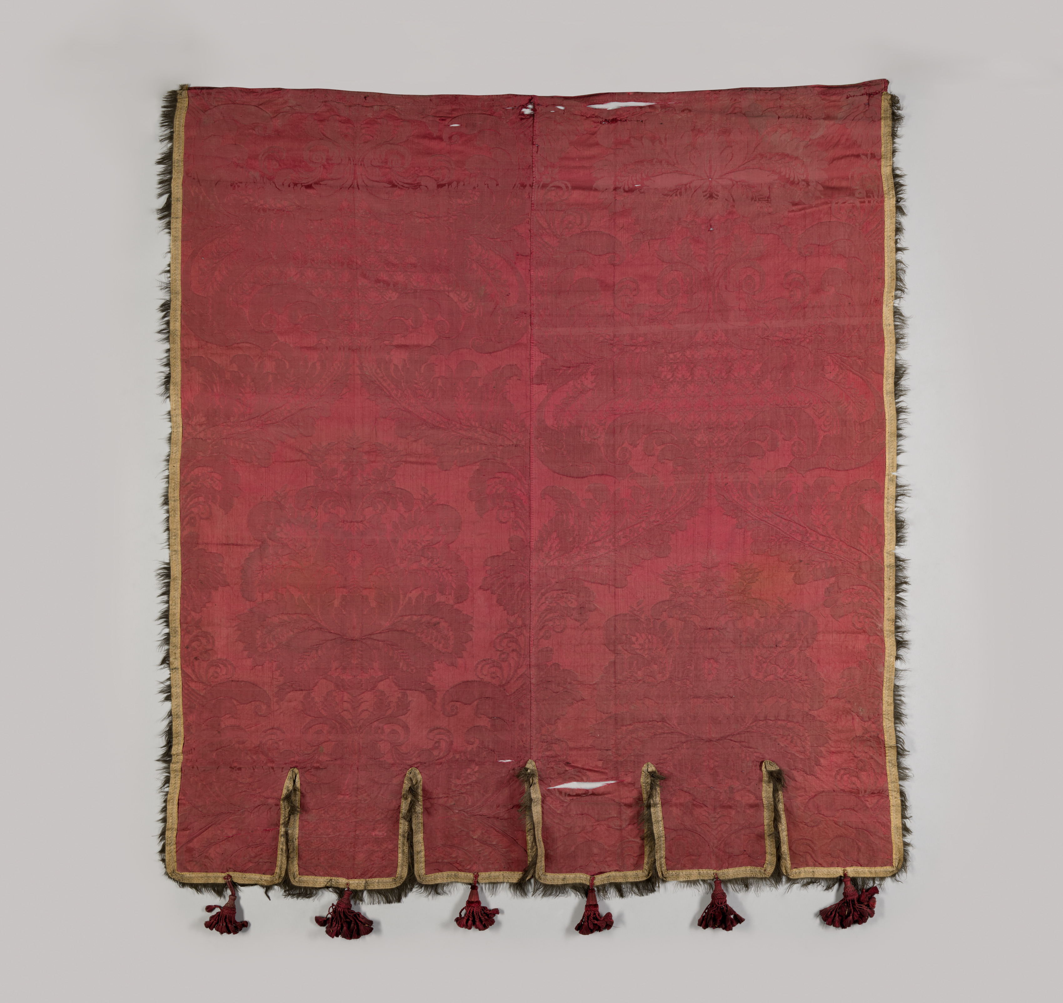 Red rectangular fabric with a subtle floral pattern, border of gold-colored fabric with short dark fringes, and six matching red tassels along the bottom edge.
