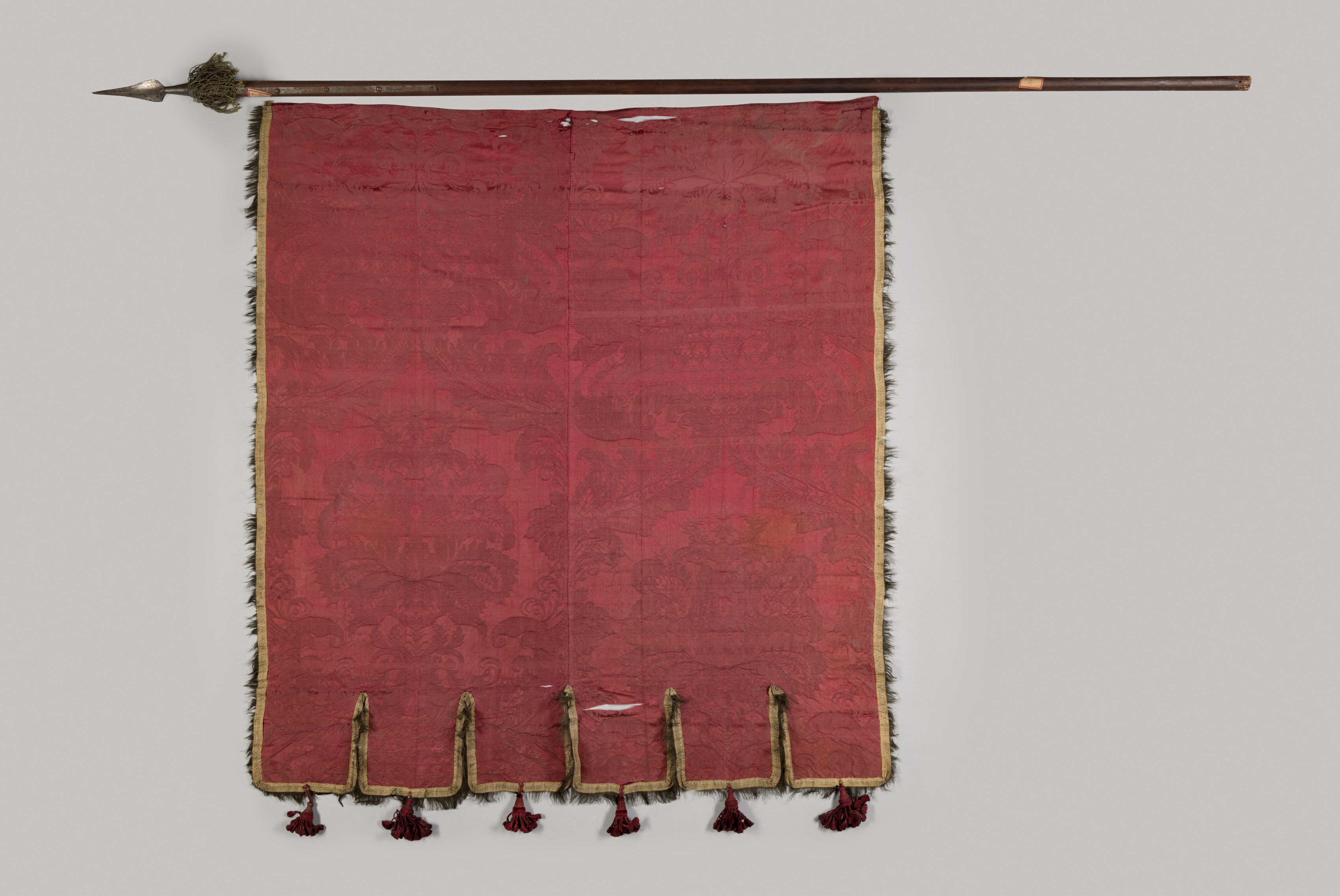 Red banner with a patterned design, frayed edges, and seven tassels along the bottom edge; long metal pole with pointed tip and tufted end above.