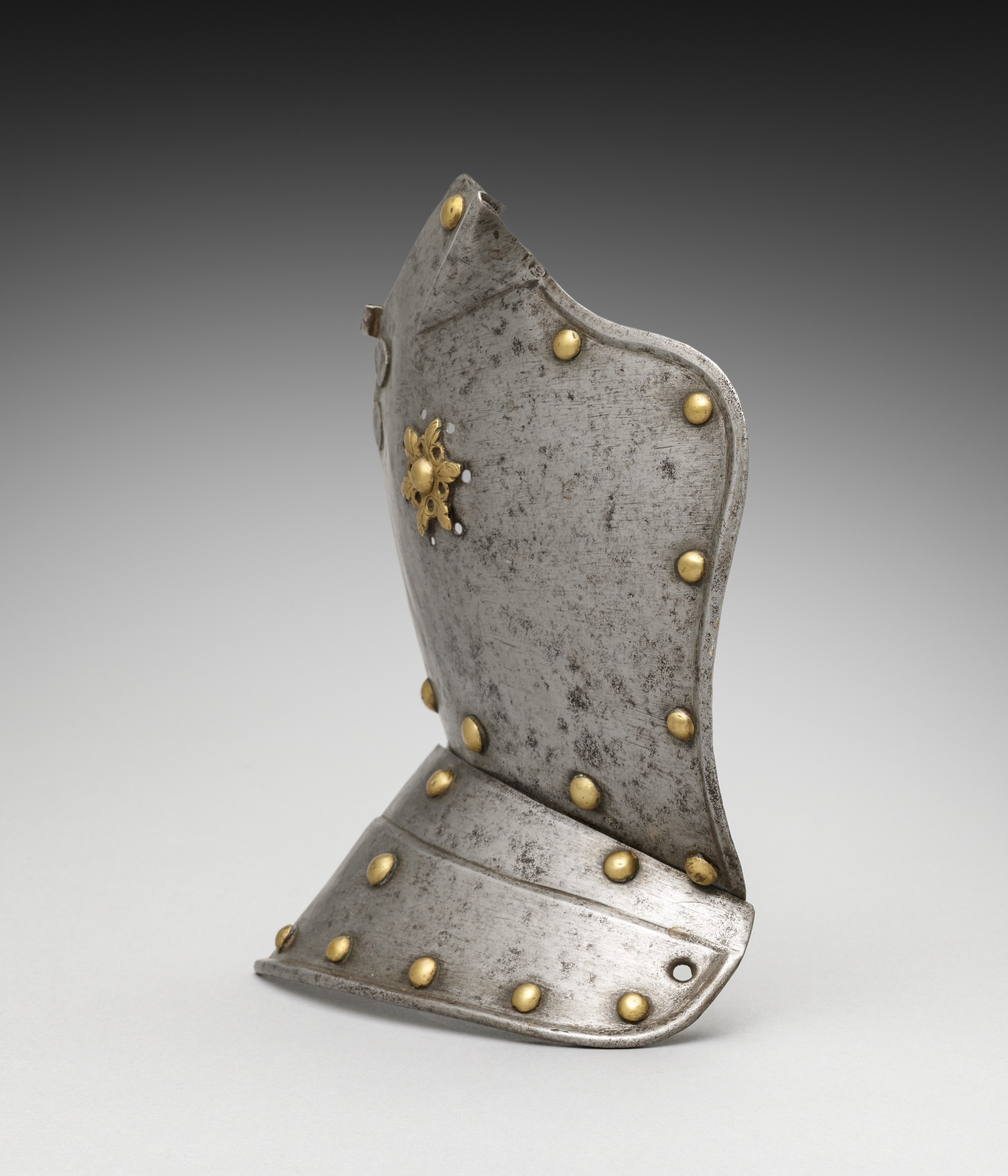 The Ear Piece of a Helmet by Unknown Artist is a grey metal piece with a wavy top edge and curved sides. The piece is shaped like the top part of a helmet that covers the ear and temple area. It has a darker patina and visible signs of wear and tear. The piece is adorned with brass rivets around the edges and a decorative brass motif on the upper left side. The bottom portion is flared and overlaps to form a small lip. The background of the image transitions from dark at the top to light at the bottom.