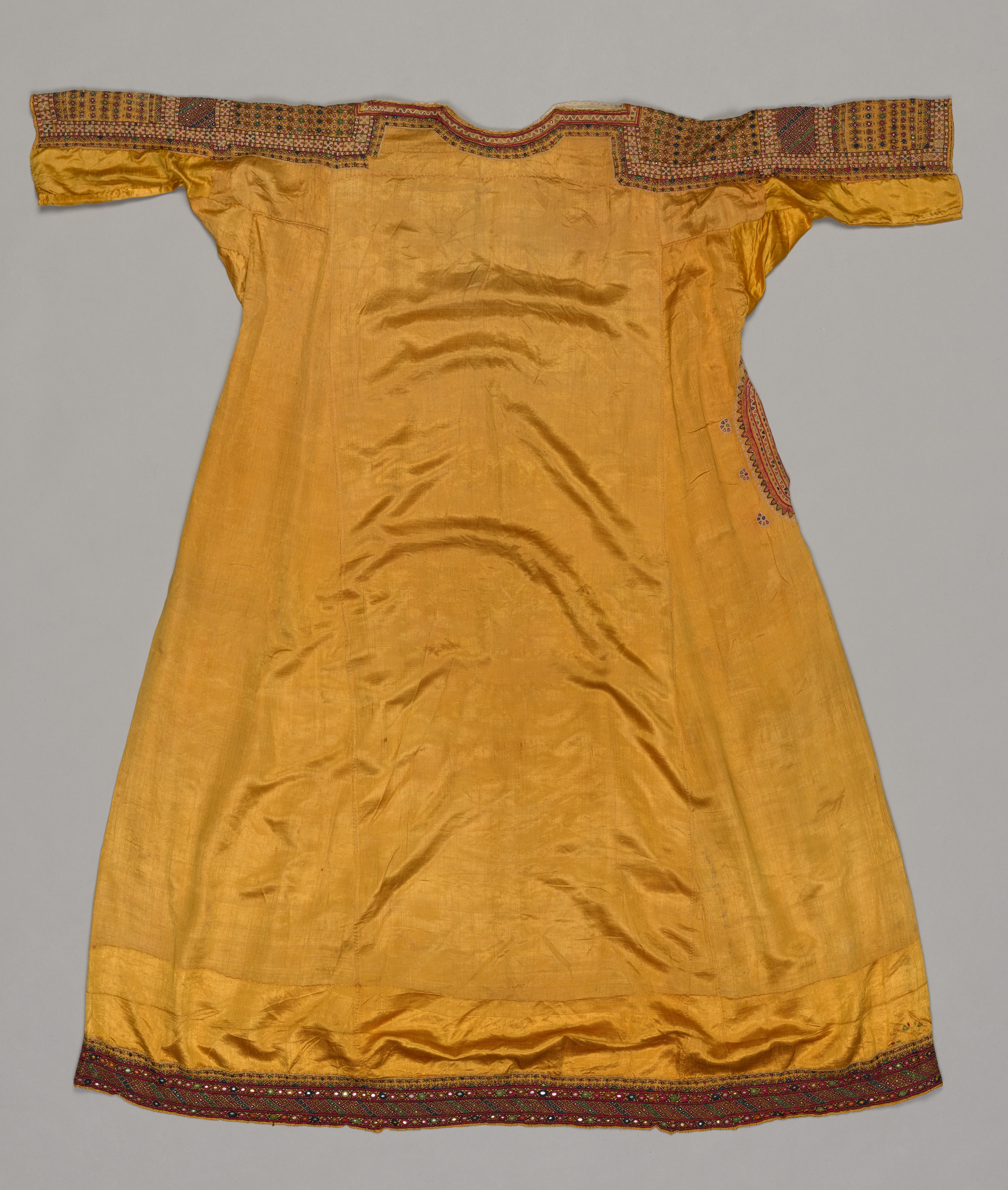 The woman's costume, by an unknown artist, depicts a yellow A-line dress with short sleeves and a short neck opening. The dress is made of shiny yellow fabric, possibly silk or satin, and has a wrinkled appearance. The dress features decorative elements on the neckline and hem. The neckline is adorned with a patterned band featuring squares and rectangles in shades of brown, red, green, and yellow. The hem is decorated with a similar patterned band in shades of brown, red, green, and white. A side seam features a red and brown patterned panel. The background of the image is grey.