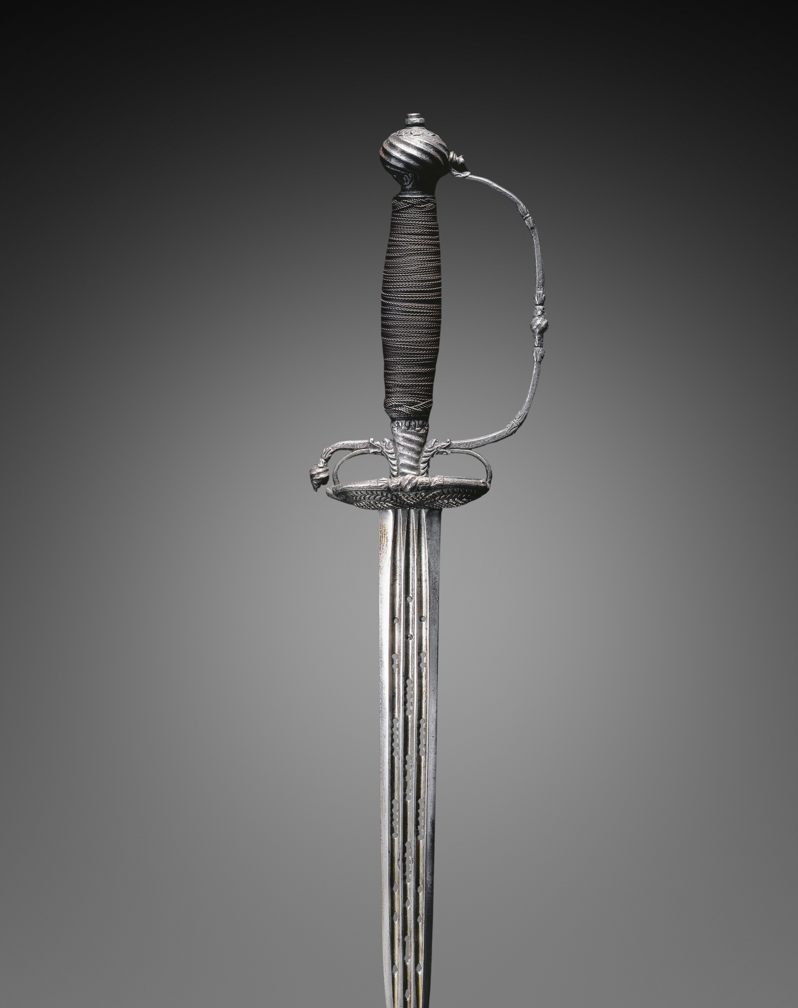 The Small Sword has a long, narrow blade with three grooves running along its length. The hilt is made of metal, featuring a spherical pommel with diagonal grooves at the top. The grip is wrapped in wire. A curved metal quillon extends to form a protective bar for the hand. The guard is decorated with engravings. The background is grey and darkens towards the edges.
