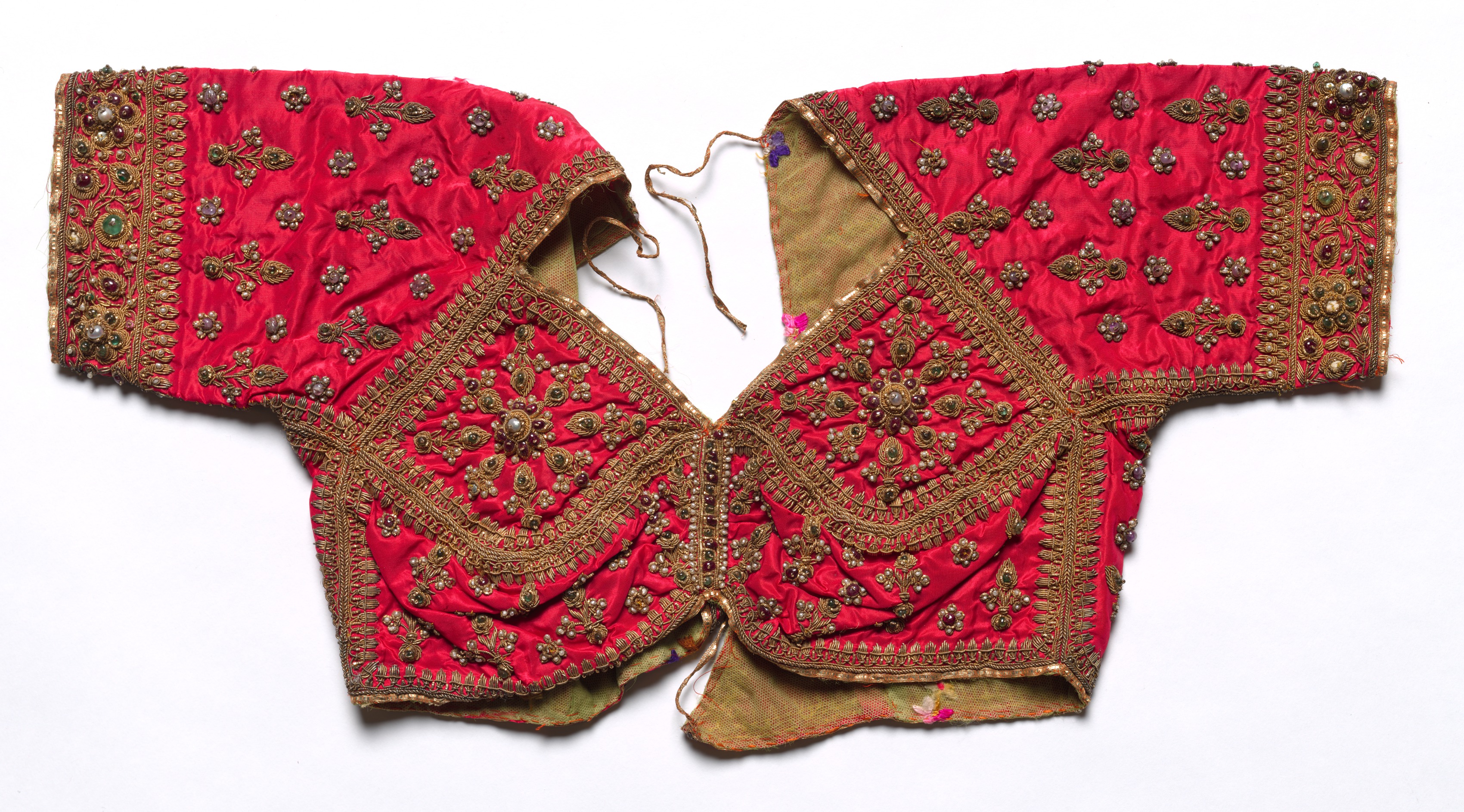 The image shows a red and gold child's bodice with intricate embroidery and embellishments. Red fabric makes up the majority of the garment. Gold fabric lines the inside. The garment has short sleeves and a V-shaped neckline. The front is decorated with gold embroidery and embellishments arranged in a floral pattern. The sleeves have a similar design to the front. There are two strings at the back of the garment for fastening. The garment is lying flat on a white background. The garment is titled "Child's Bodice". The artist is unknown.