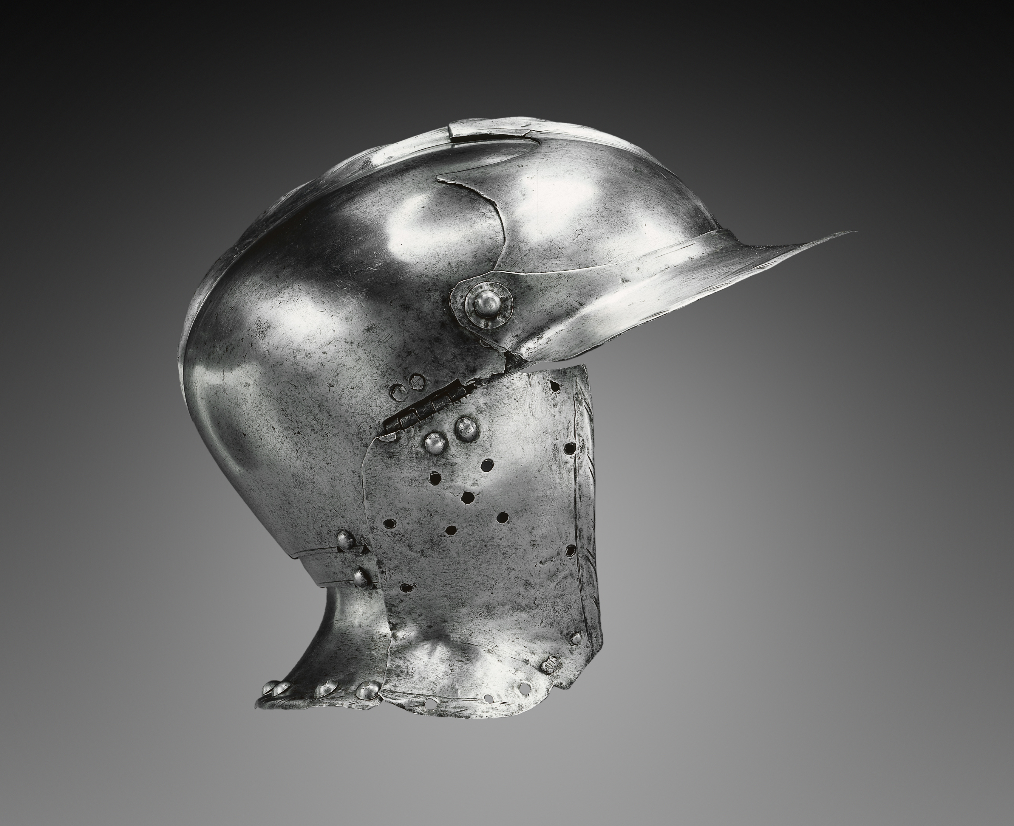 The Burgonet, by an unknown artist, is a silver-colored metal helmet with a rounded top and a long, pointed visor that extends outward and to the right. The helmet has a curved shape, with a small lip around the bottom edge. There are several rivets visible on the helmet, particularly on the lower portion. The surface of the helmet shows signs of wear and tear, with scratches and scuffs visible. The background of the image is a gradient that transitions from dark gray at the top to light gray at the bottom. The helmet is positioned at an angle, with the visor pointing to the right side of the image. The overall appearance of the helmet suggests it is made of metal, likely steel or iron, and has a weathered appearance.