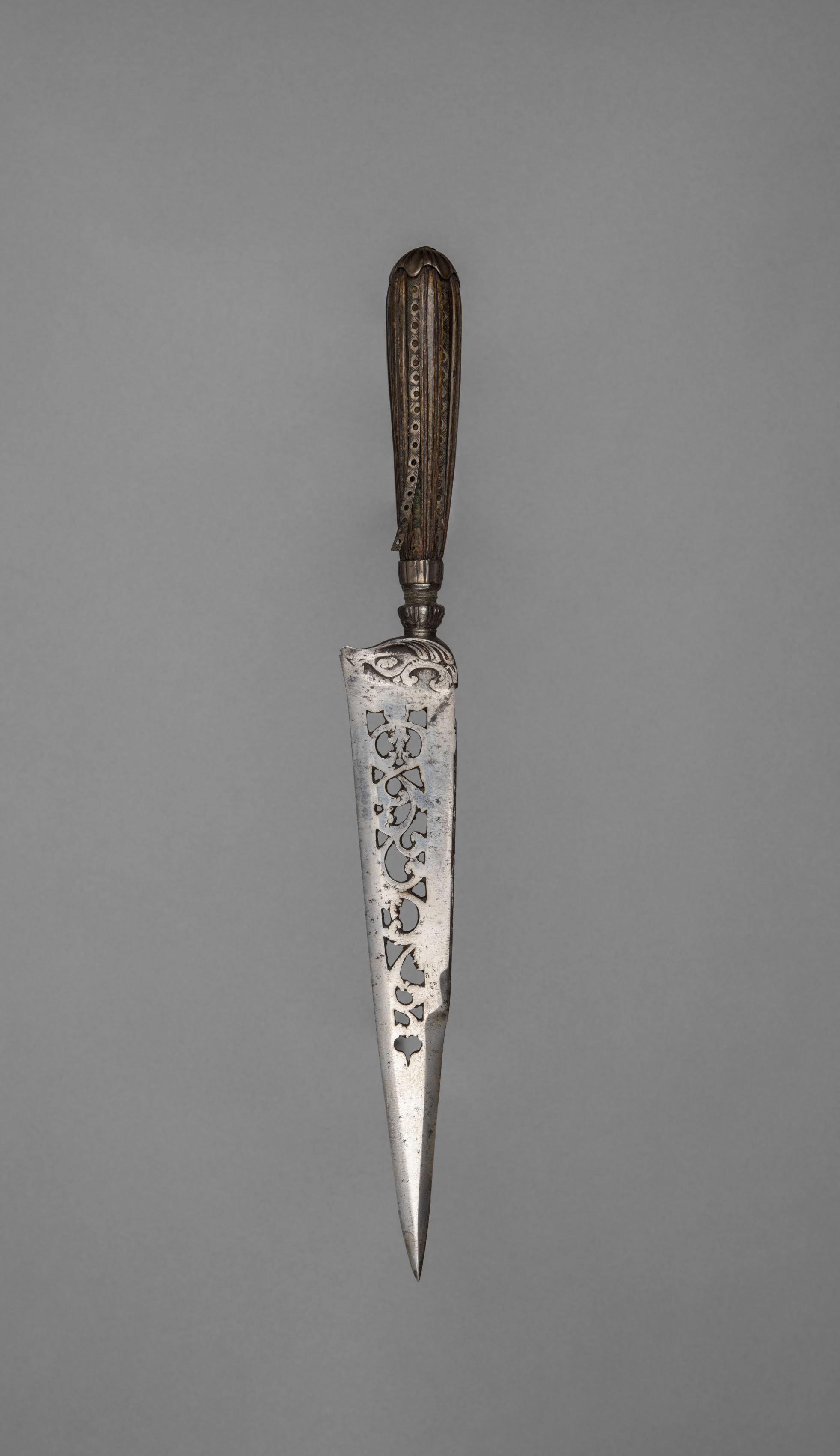 The image shows a knife with a silver blade and a dark-colored handle. The blade is long and narrow, tapering to a point at the tip. The blade has etchings on it. The handle is made of a darker material, possibly wood or metal, and has a ribbed design. The background of the image is a solid gray color. The image appears to be a photograph of a collectible knife. The title of the image is "Knife".