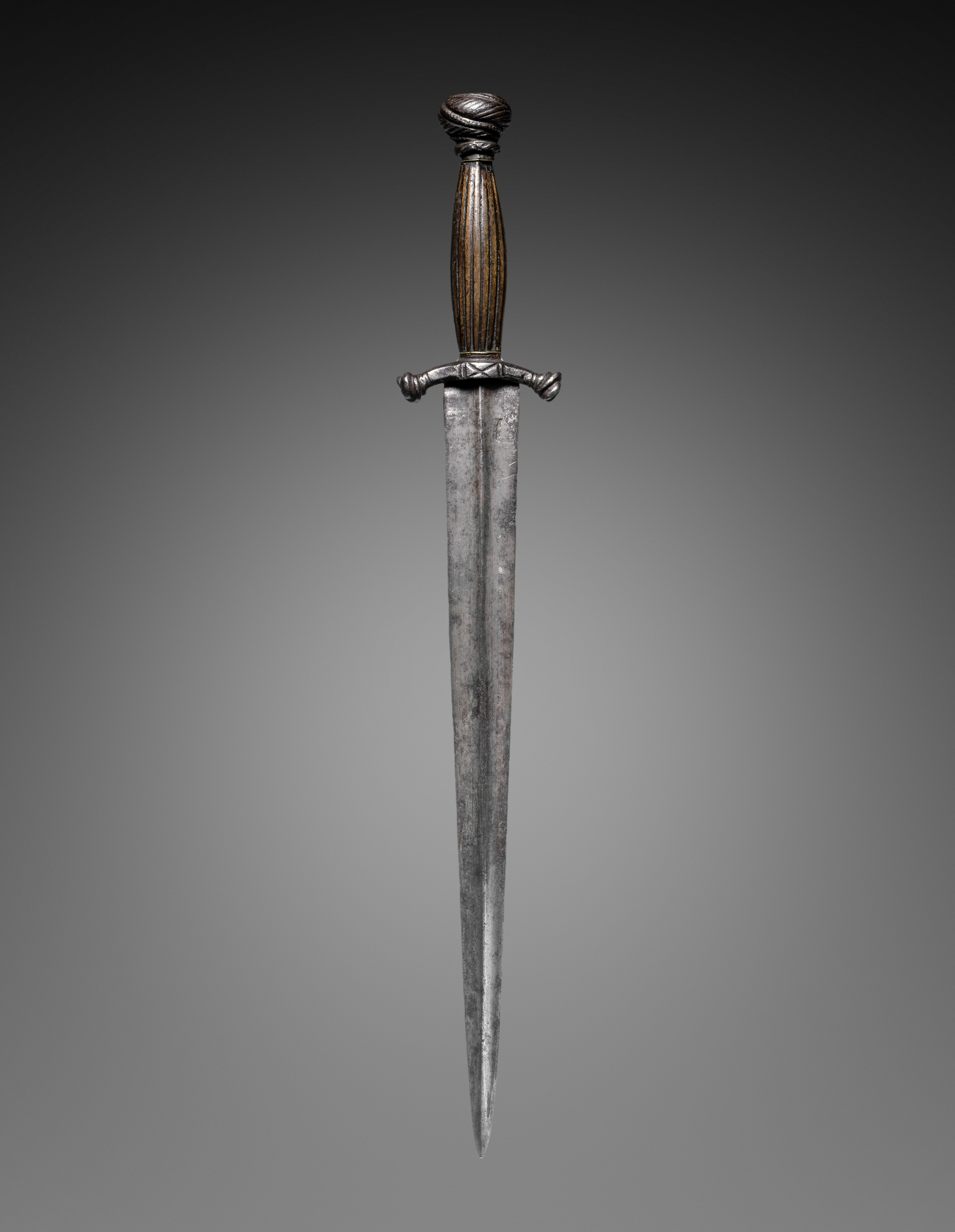 A dagger with a wooden and metal handle and a metal pommel has a long, thin silver metal blade with a slight curve; two metal crossguards curve out on either side of the blade; background is gray. Artist: Unspecified Title: Dagger