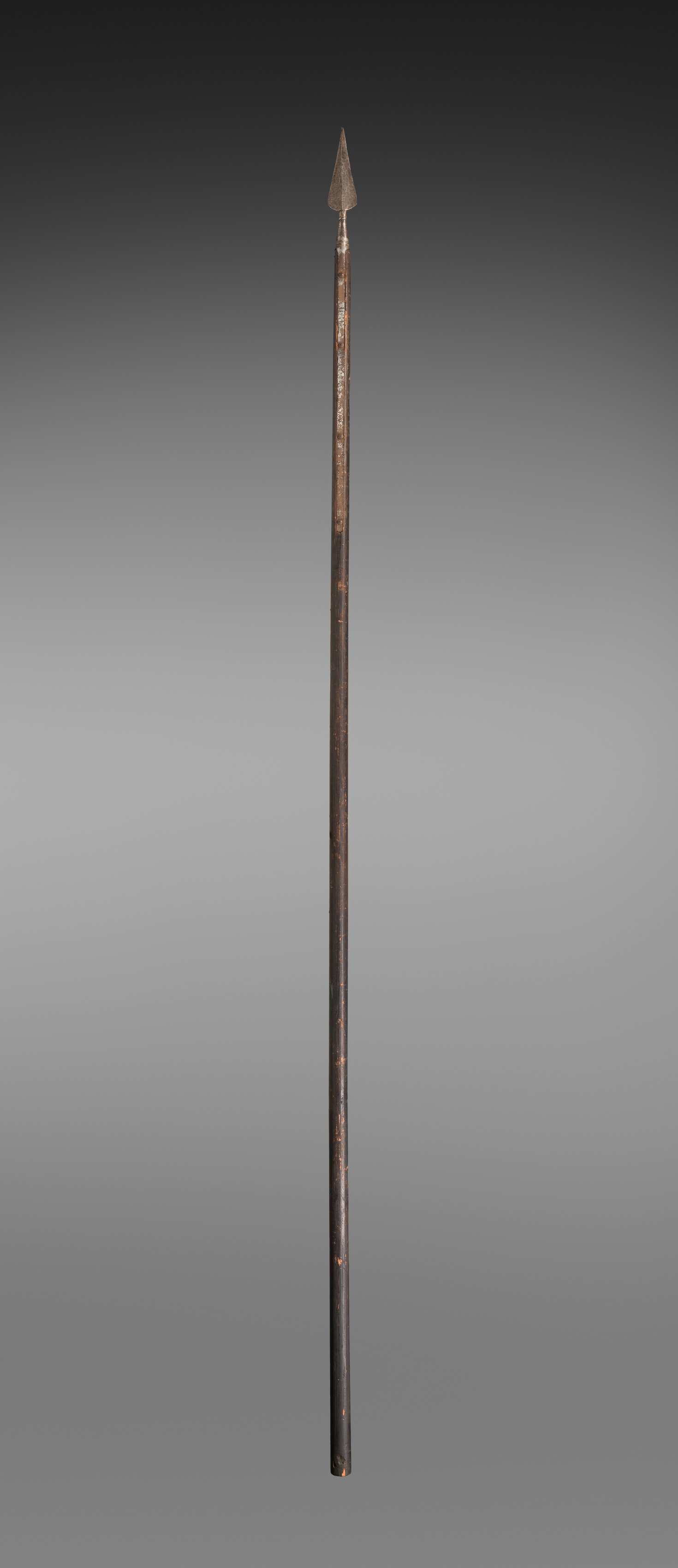 Long metal spear with triangular tip, shaft has darker color at bottom and lighter at top with some rust spots; banner; Artist: unidentified.