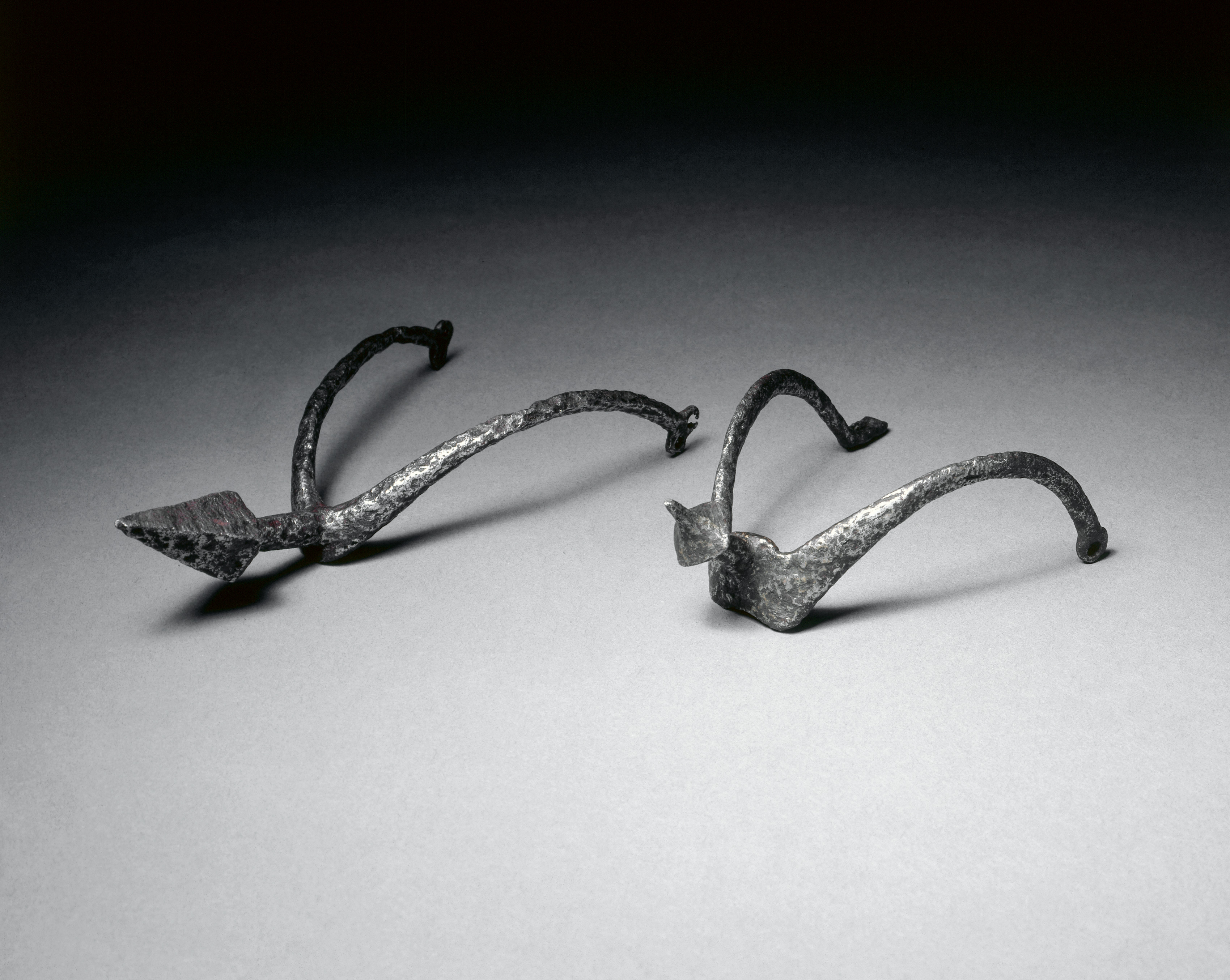 The image depicts a pair of metal spurs. Two spurs are shown lying on a surface; they are made of dark metal and appear to have a rough texture. The left spur lies with the heel of the boot area facing left. The right spur lies with the heel of the boot area facing right. Both spurs have a curved shape, with two prongs extending from the heel of a boot area. The prongs are pointed and slightly curved. The background is a plain surface with a gradient from dark to light gray. The lighting is dim, with shadows cast by the spurs. The overall atmosphere suggests a product photo or museum display. Pricked Spur by an unknown artist.