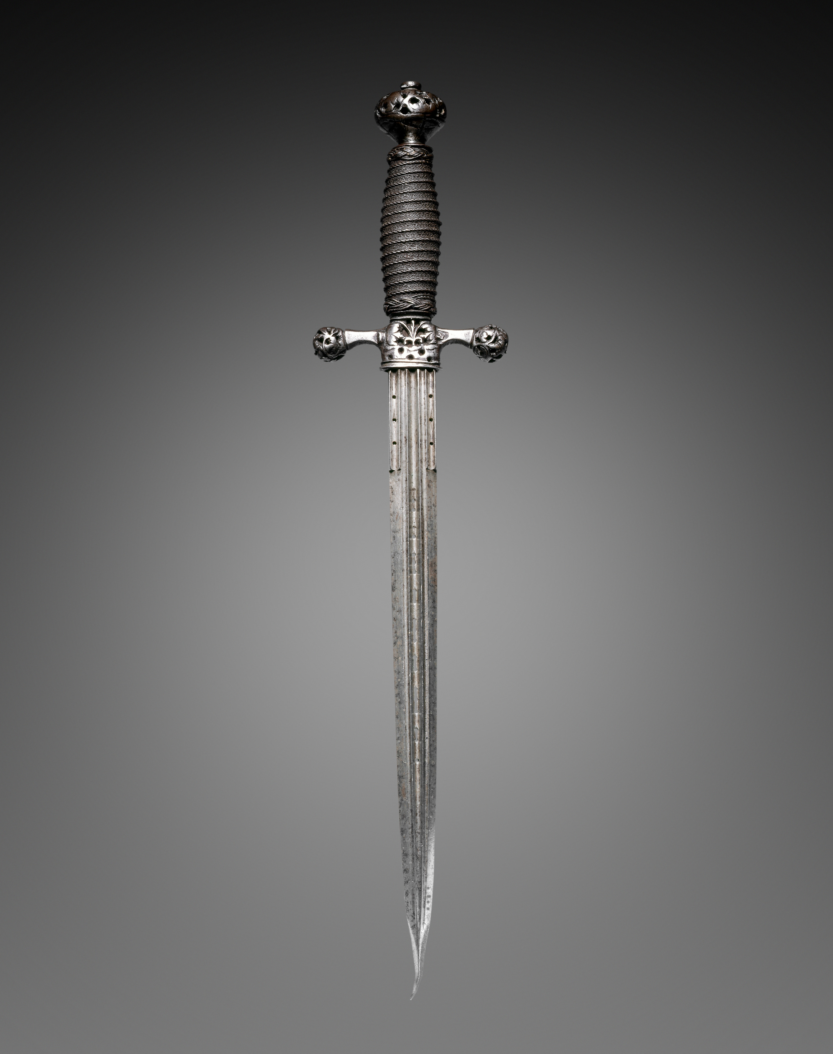 The dagger has a long, slender blade with a pointed tip. The blade is silver with a slight grayish tint. It features a crossguard with spherical ends. The handle is wrapped in dark material, possibly leather or cord, and topped with a spherical pommel. The dagger appears to be set against a gradient background transitioning from dark gray to light gray. The artist and title of the piece is "Dagger".