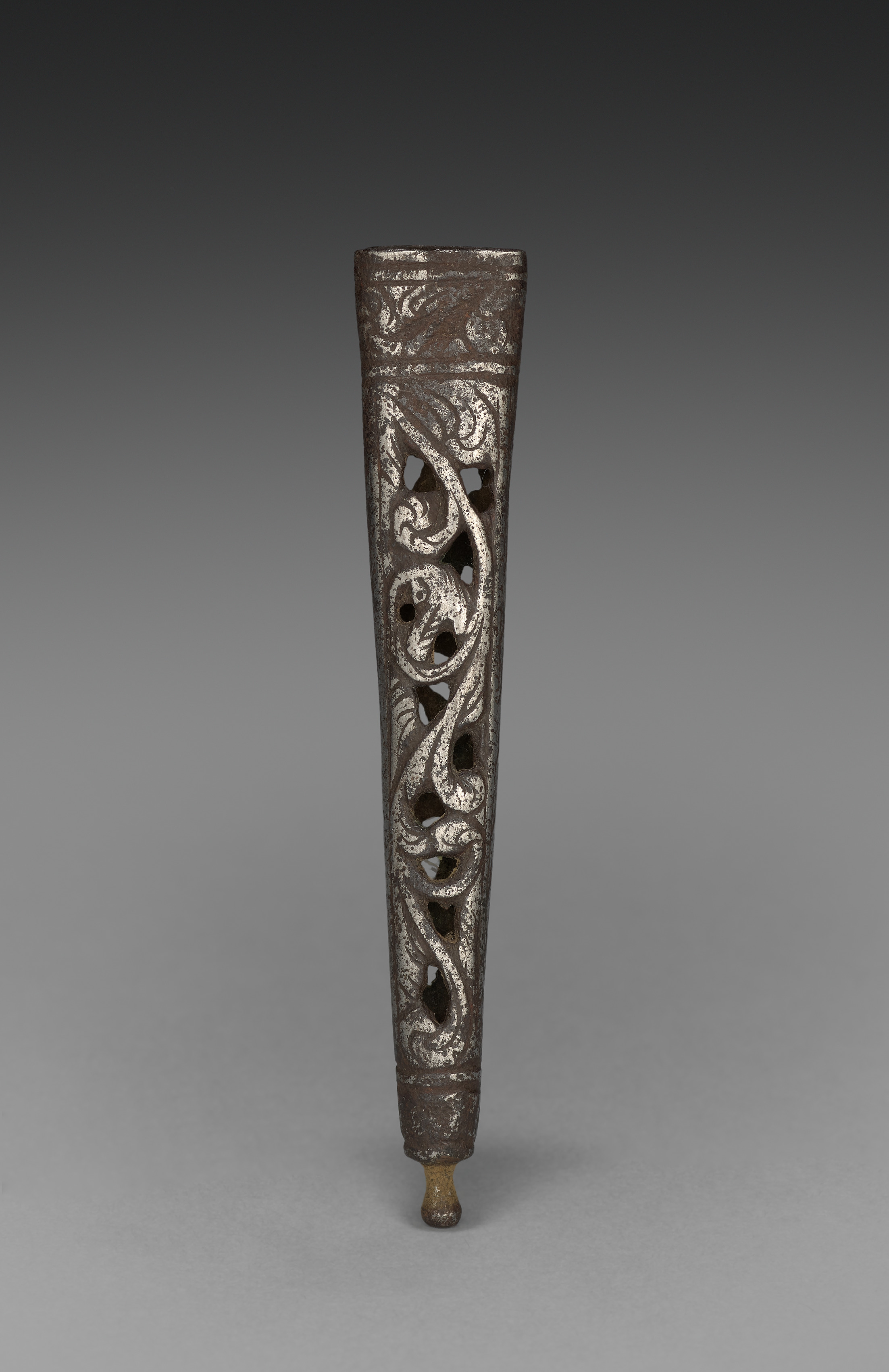 Sheath Tip by Einar A long, cylindrical metal object with a tapered shape, wider at the top and narrower at the bottom. The object is made of dark brown metal with a weathered appearance. The surface features intricate cut-out designs consisting of swirling patterns and curved lines. The top section has a solid band with cut-out patterns across the top. The object appears to be standing on a small, rounded gold-colored stand or base. The background is gray fading to black at the top.