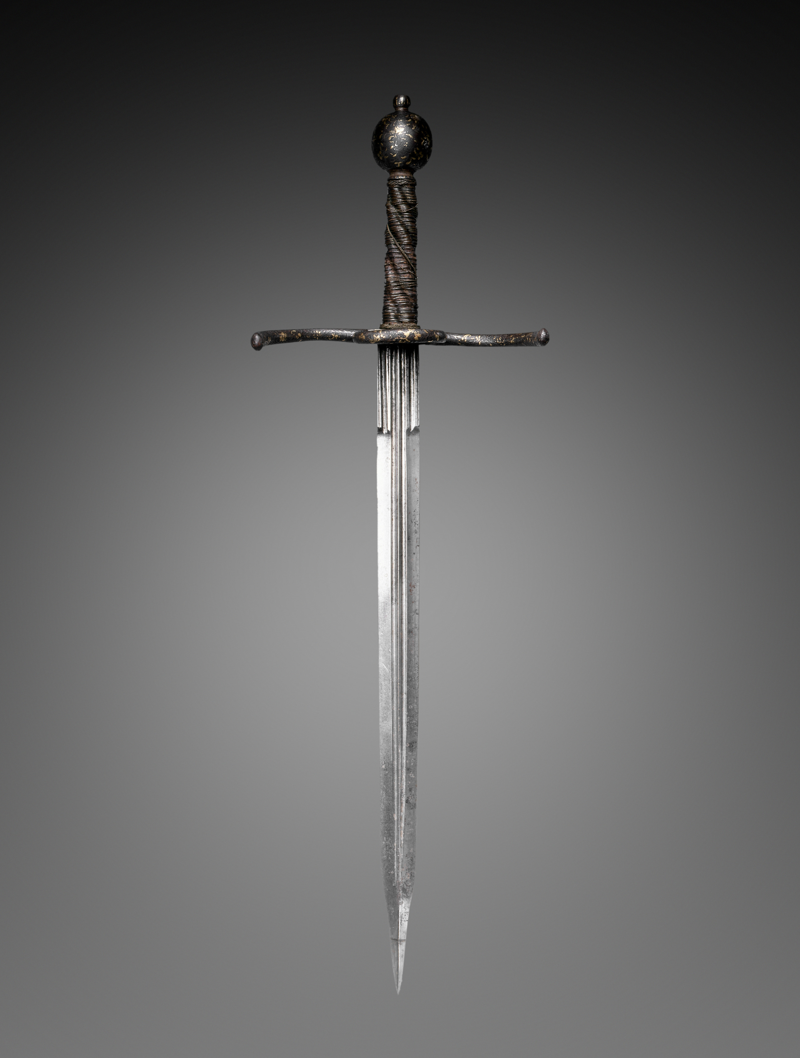 The dagger has a long, slender blade with a sharp point. The blade is straight and single-edged. The blade's surface shows signs of wear and aging. The hilt is made of metal, with a spherical pommel at the top. The grip is wrapped in twisted metal wire. The crossguard is straight and has a slight curve at the ends. The dagger's overall color is a dark silver or gray. The background of the image is a gradient from dark gray to light gray. The dagger's title is "Dagger" and it is by an unnamed artist.