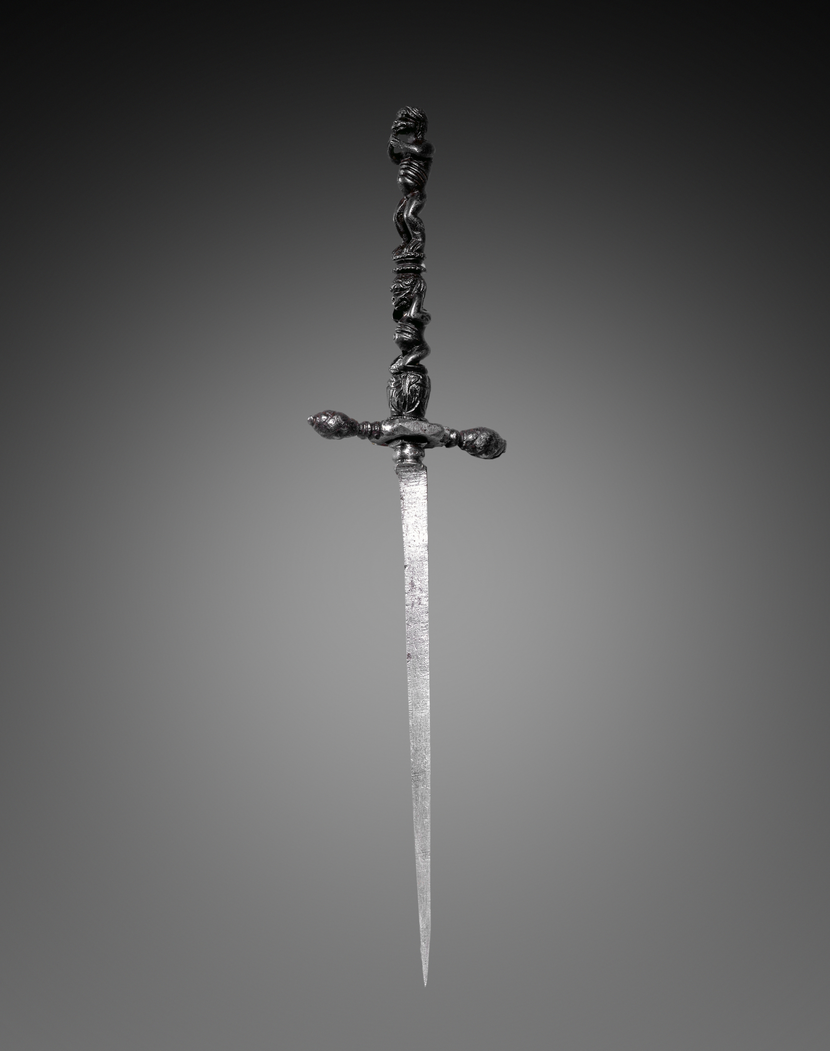 Stiletto by artist. The dagger has an overall dark color. The handle is long and thin with a figure on top. The figure on top appears to be human with outstretched arms. The figure is wrapped in a long serpent-like object. The handle has cross-shaped indentations below the figure. There are three nose-like protrusions on the handle below the cross-shaped indentations. The cross-guard is shaped like a bar with bulbous ends. The blade is long and thin with a slight texture along its length. The blade tapers to a sharp point. The background transitions from dark at the top to light gray in the center and dark again at the edges.