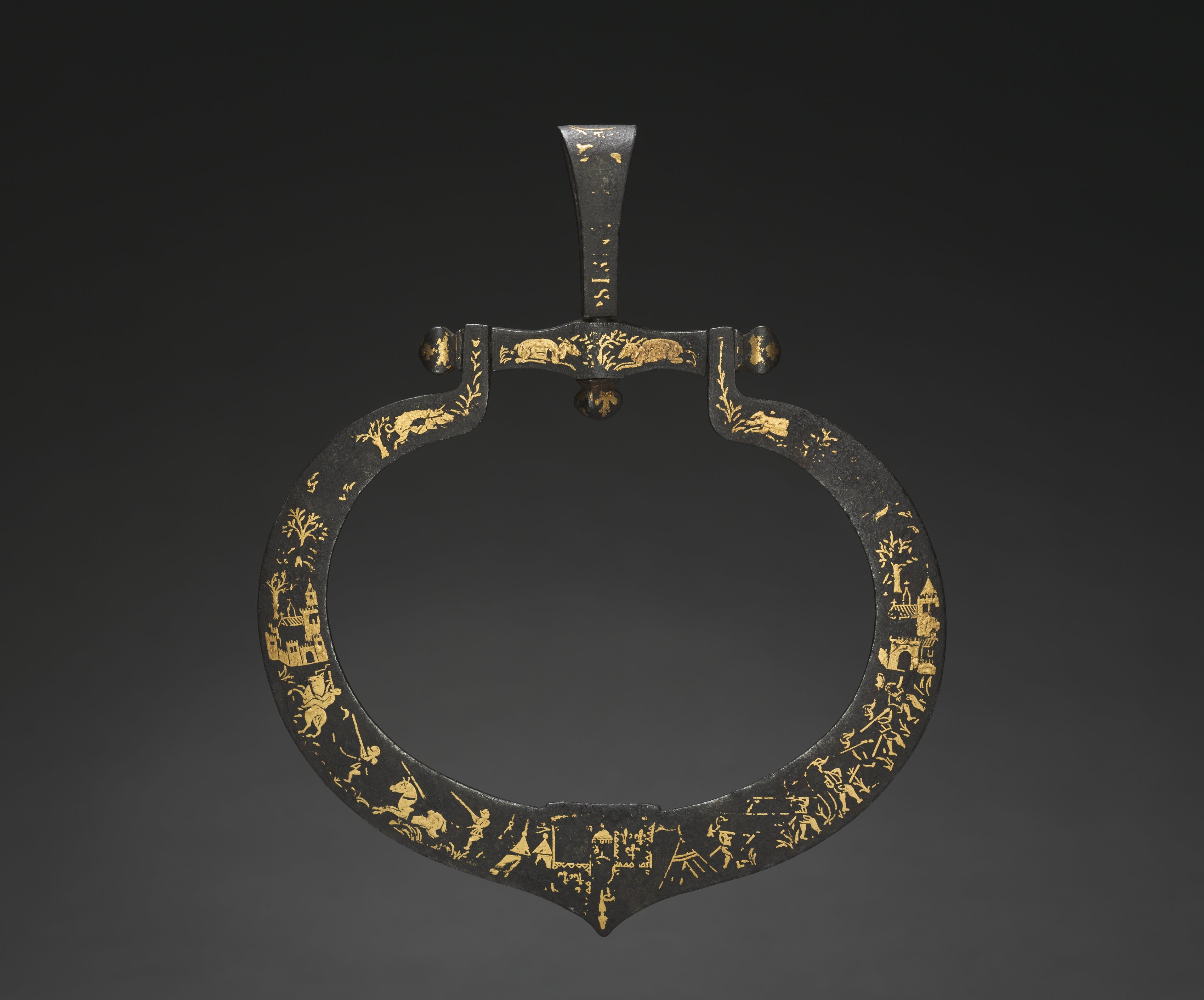 Black metal purse or escarcelle mount with a rounded bottom and a small tab at the top. The mount features a curved, open design with two small knobs on either side near the top. The surface is adorned with gold inlays depicting various scenes and motifs, including animals, plants, buildings, and people engaged in activities such as hunting and fighting. The gold inlays are scattered across the black metal surface, giving the piece a decorative and ornate appearance.