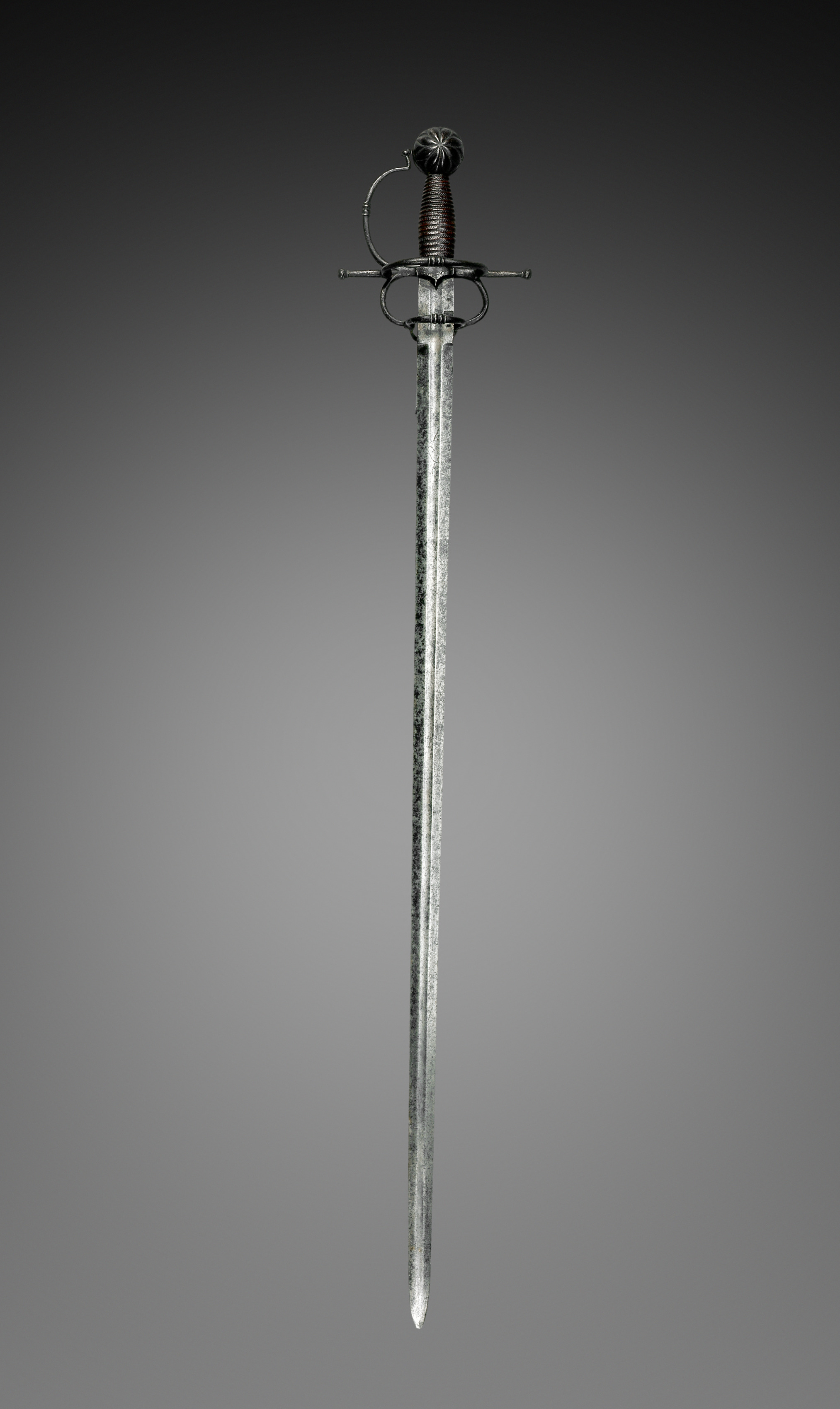 Metal sword with a long, slender blade and pointed tip, exhibiting a worn, weathered appearance. The hilt features a round pommel and a coiled, dark-colored grip. A short crossguard is present, with a curved quillon on one side. The background transitions from dark at the top to light gray in the center and back to dark at the bottom. Sword by artist unknown.