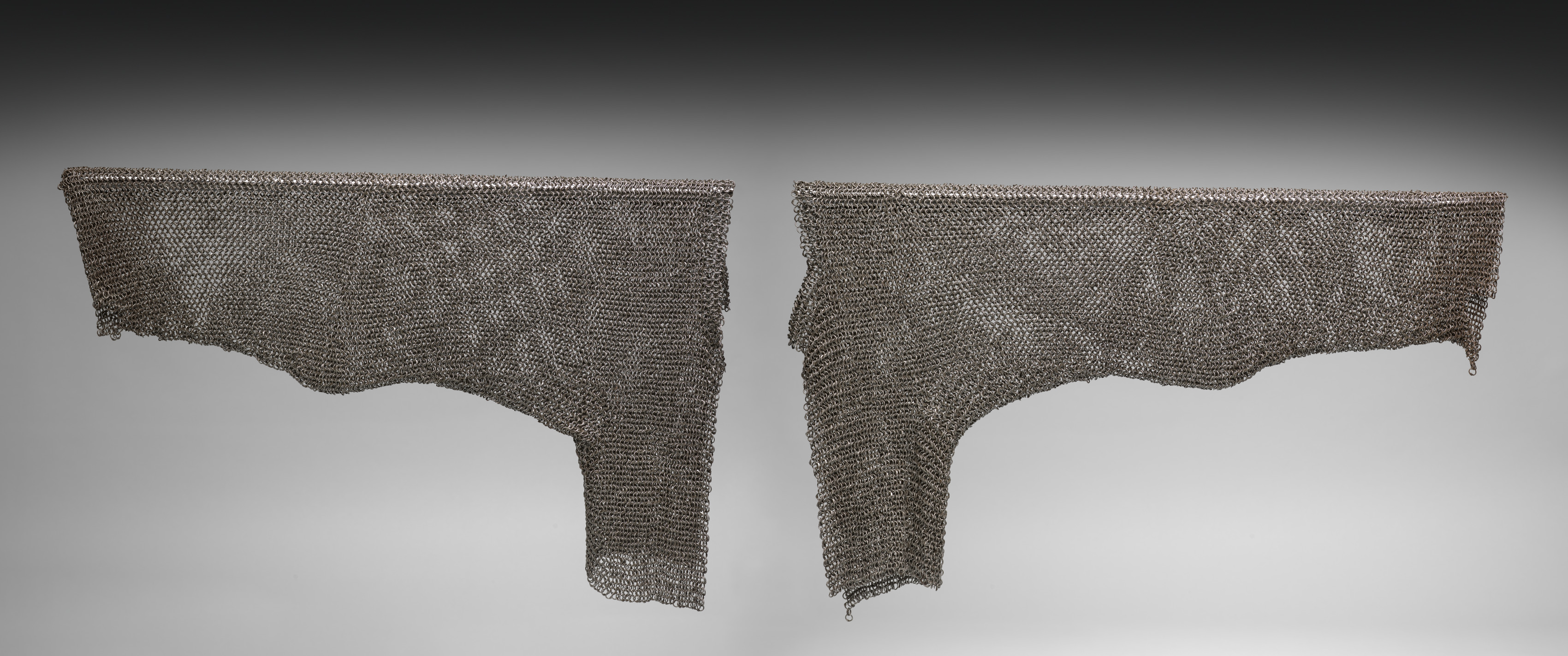 The image shows two pieces of chain mail. The pieces are made of interlocking metal rings and have a rough, woven texture. They are shaped like the top part of a sleeve, with a curved bottom edge and a straight top edge. The left piece has a more jagged bottom edge and a small tail of chain mail hanging down. The right piece has a smoother bottom edge and a longer tail of chain mail hanging down. The background is a gradient from dark gray at the top to light gray at the bottom. The artist and title associated with the image are "Sleeves of Chain Mail".