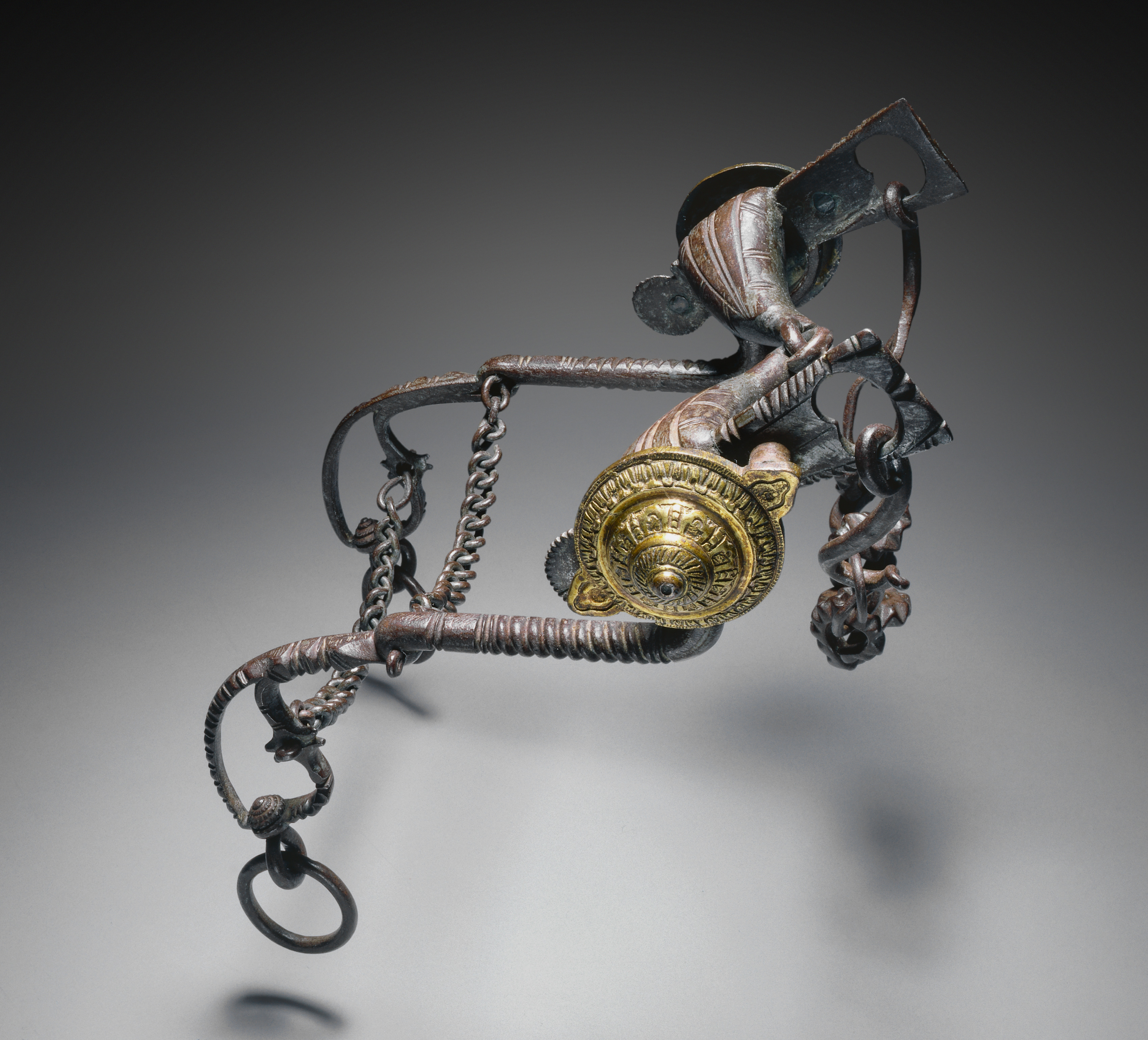 Metal bit with a curved, horizontal bar and a vertical post on the right. The horizontal bar features a gold-colored, circular piece with a sunburst design and text. A metal chain hangs from the left side of the bar. A small ring and a larger ring with a decorative element are attached to the left end. On the right side, a coiled section connects to another curved piece with a decorative end. The bit shows signs of rust and wear. The background gradient transitions from black at the top to gray at the bottom. Curb Bit by Pablo Picasso.