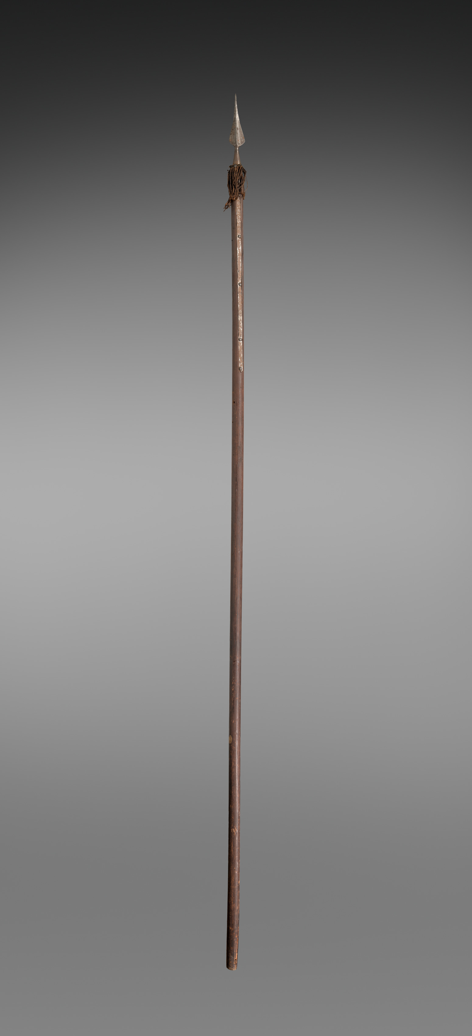 Long, thin, wooden pole with pointed metal tip. The pole is light brown with darker brown patches. A small piece of brown twine or cordage wraps around the top of the pole beneath the metal tip. The metal tip is triangular and appears to be made of silver or white metal. The background is a gradient from dark gray at the top to light gray at the bottom. Pole by artist.