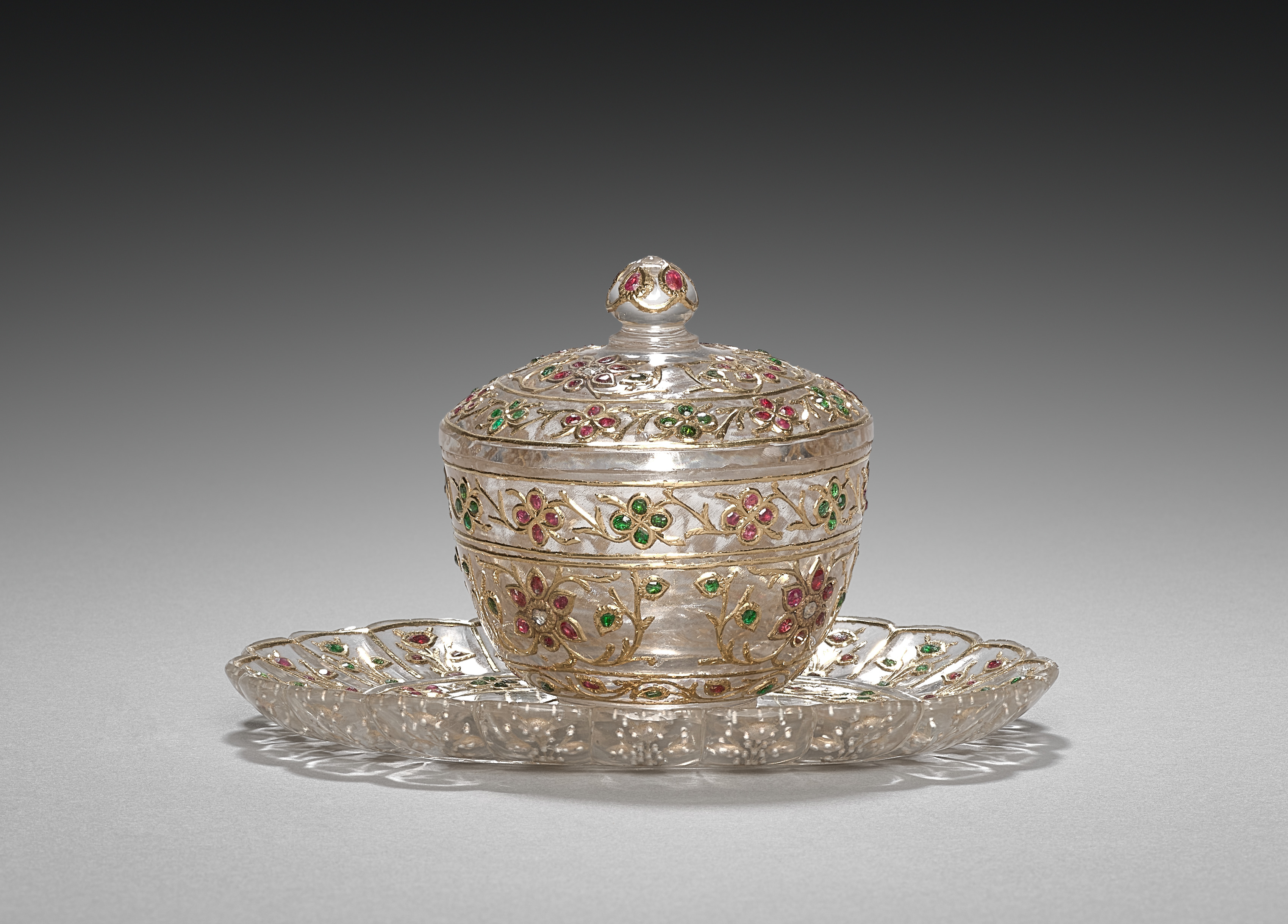 Silver jar with cover and saucer. The jar has a rounded body with a short neck and a domed lid with a small finial on top. The jar, lid and saucer are decorated with gold etchings and inlaid with pink and green gems arranged in a floral pattern. The saucer is scalloped.