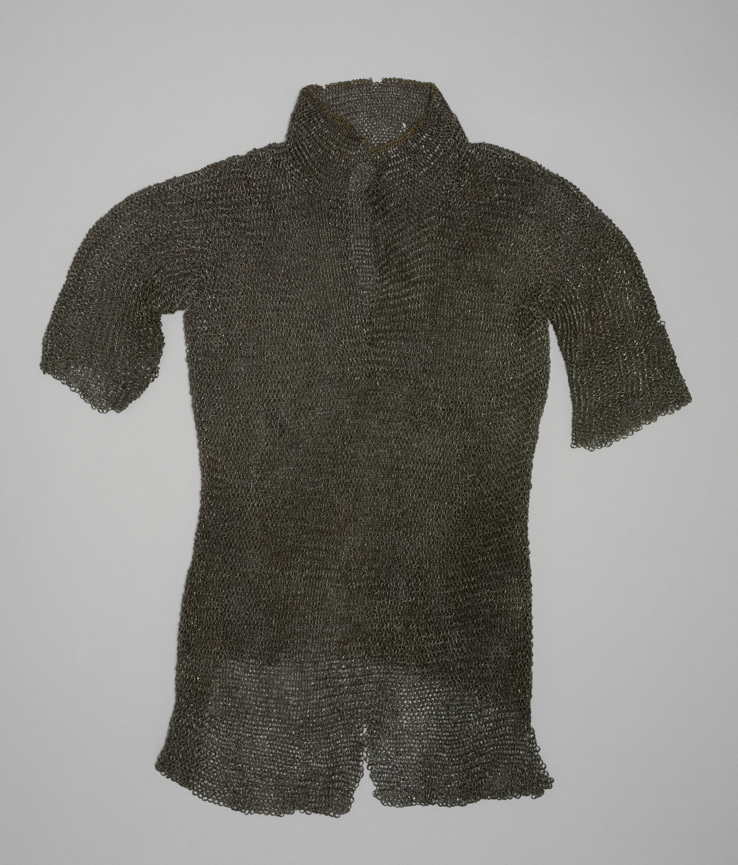 The image shows a short-sleeved, dark-colored, chain mail shirt known as a Hauberk by artist unknown. The shirt has a high, rounded collar and is made up of small, interlocking metal rings that form a mesh pattern. The sleeves are short, reaching just above the elbow, and the bottom hem is slightly flared. The shirt appears to be knee-length, with a straight cut at the bottom. The background of the image is a plain gray color. The shirt is displayed flat, with no visible fastenings or closures. The metal rings are densely packed and have a uniform texture.