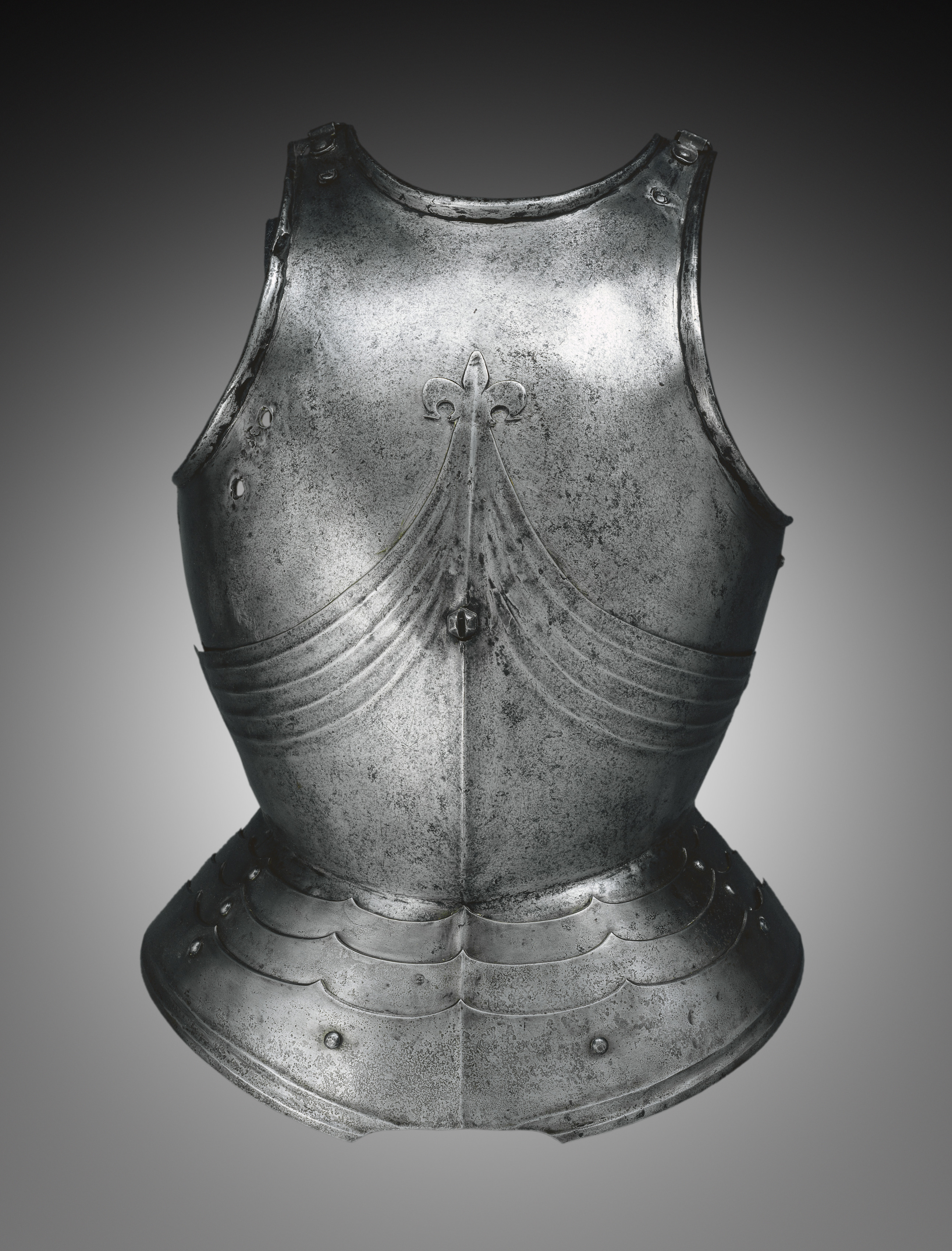 Gothic Breastplate by Hans Stopler, a silver metal chest plate with a wide flat base that is slightly curved upwards, with overlapping metal plates around the bottom; long horizontal lines on the lower part; a raised design on the chest resembling an upside down fleur-de-lis; two shoulder straps with rivets; a scratched and pitted surface; on a gray gradient background.