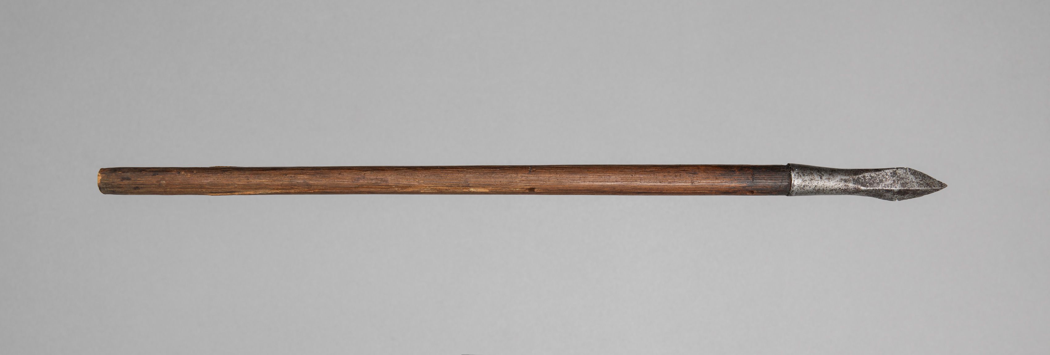 The Crossbow Bolt by unknown artist shows a long, straight wooden shaft with a metal tip. The shaft is brown and has visible wood grain and imperfections. The metal tip is silver-colored, triangular in shape, and appears to be made of a single piece of metal. The metal tip is attached to the wooden shaft. The background of the image is a solid gray color. The bolt is centered in the image, with the metal tip pointing to the right.