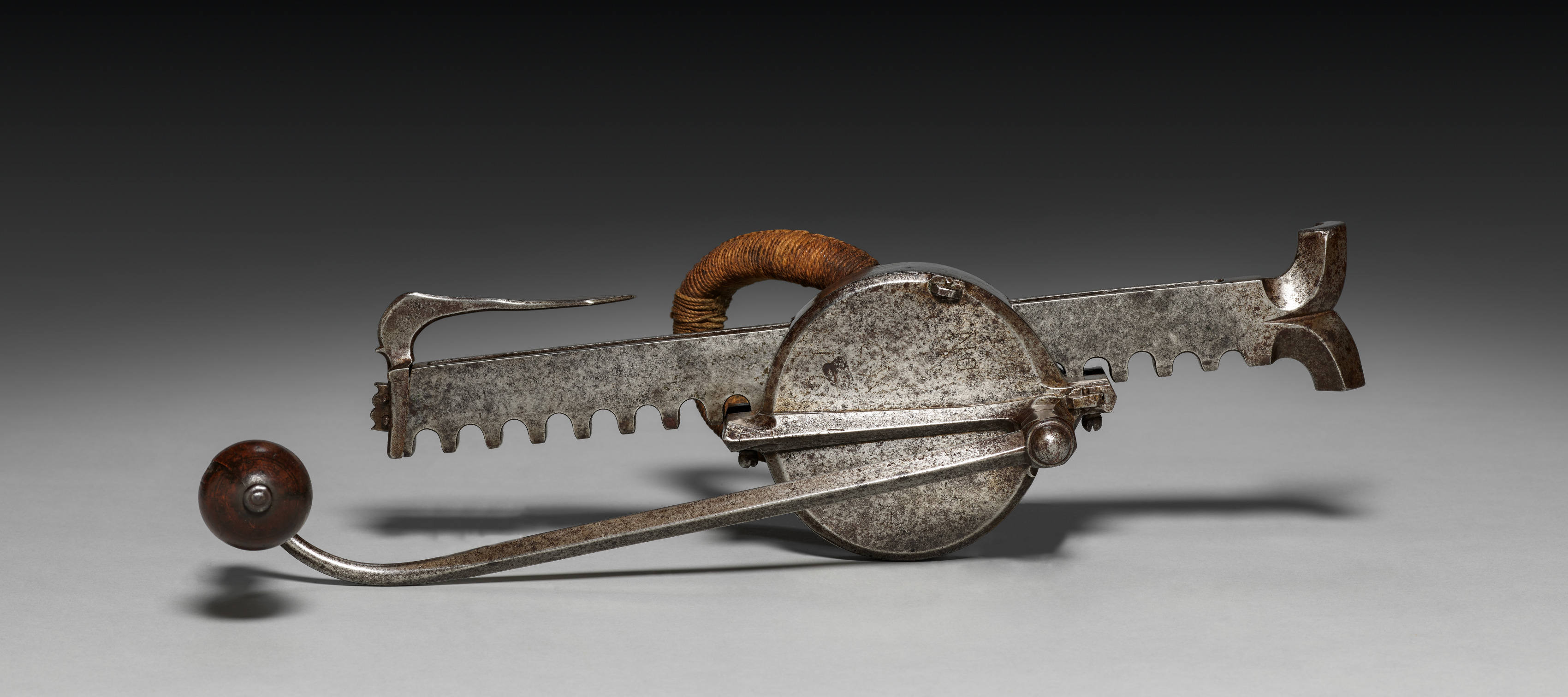 The image depicts a metal device with a serrated blade, titled "Cranequin" by the artist. The device has a long, narrow, serrated metal blade. The blade is attached to a circular metal piece with a handle wrapped in brown material. A curved metal piece extends from the circular piece, ending in a dark wooden ball. The device has a metal lever that connects to the circular piece and ends in a dark wooden handle. The background is a gradient from dark at the top to light gray at the bottom. The device casts a shadow on the surface below it.