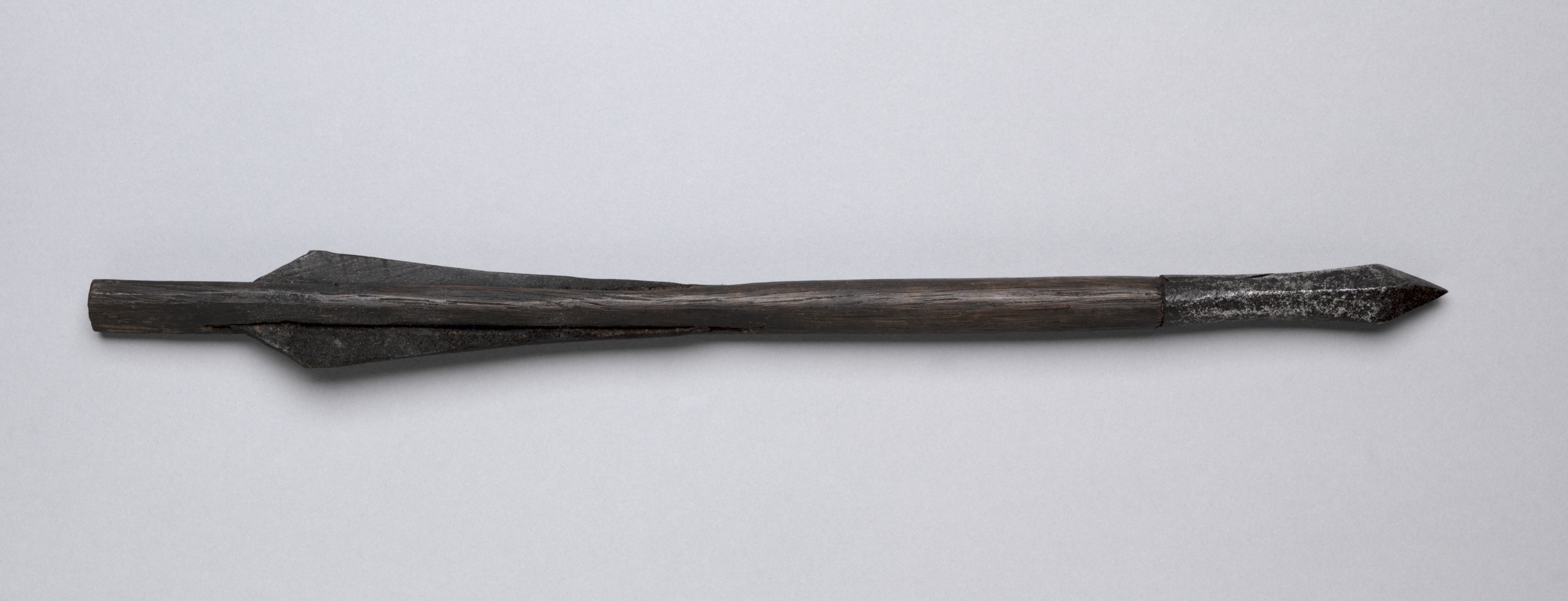 Dark wooden crossbow bolt with metal tip; bolt has a long, thin, cylindrical body; two flat, triangular metal fins on one end; metal tip on the other end; metal tip is pointed; background is light gray. Crossbow Bolt, by artist unknown.