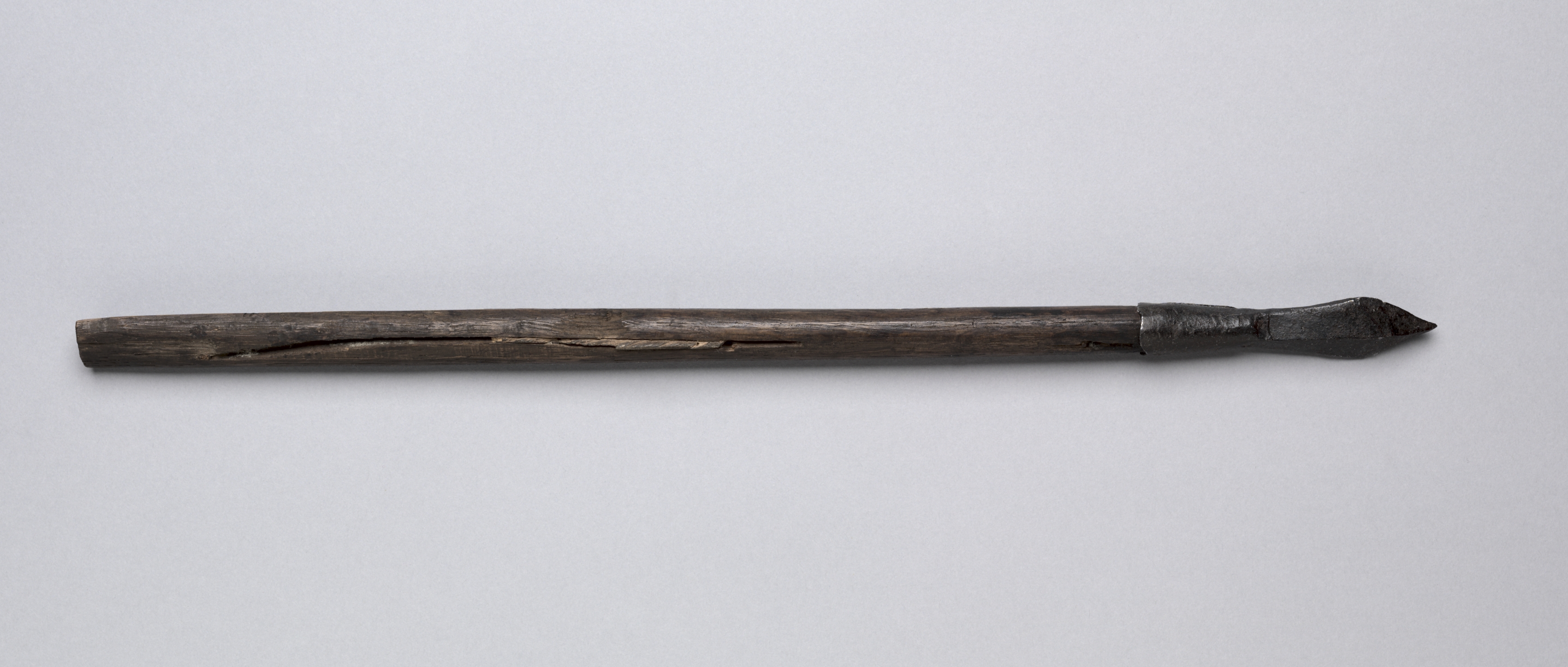 Dark brown wooden shaft with visible cracks and discoloration, metal tip with square base and four-sided pyramidal point.