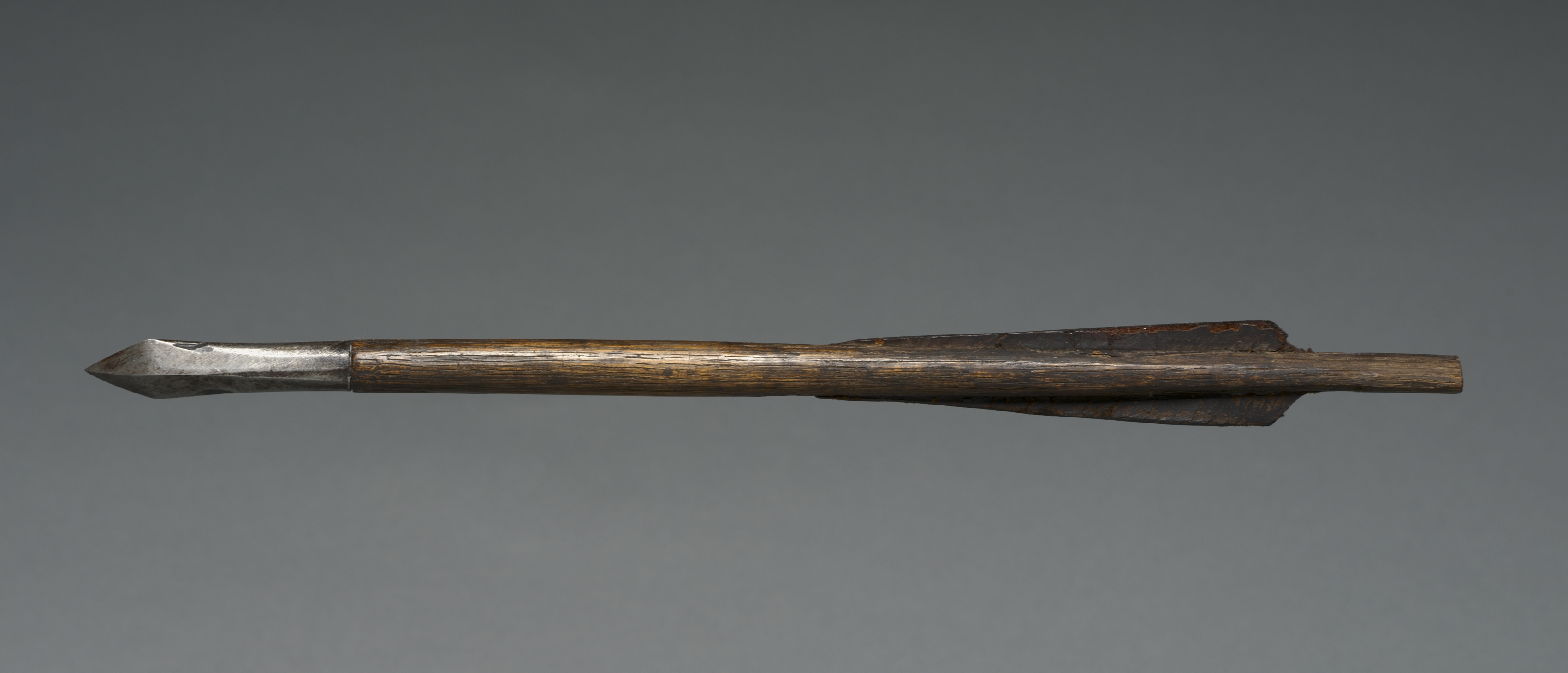 Crossbow Bolt by unknown artist. Metal tip, triangular in shape with a pointed end. The metal tip is attached to a wooden shaft. The wooden shaft is cylindrical and appears to be made from a single piece of wood. There are two small, triangular protrusions on the shaft near the end, likely fletching. The fletching appears to be made from wood or another rigid material. The entire bolt is set against a solid gray background. The bolt is positioned horizontally. The metal tip is on the left side. The fletching is on the right side.