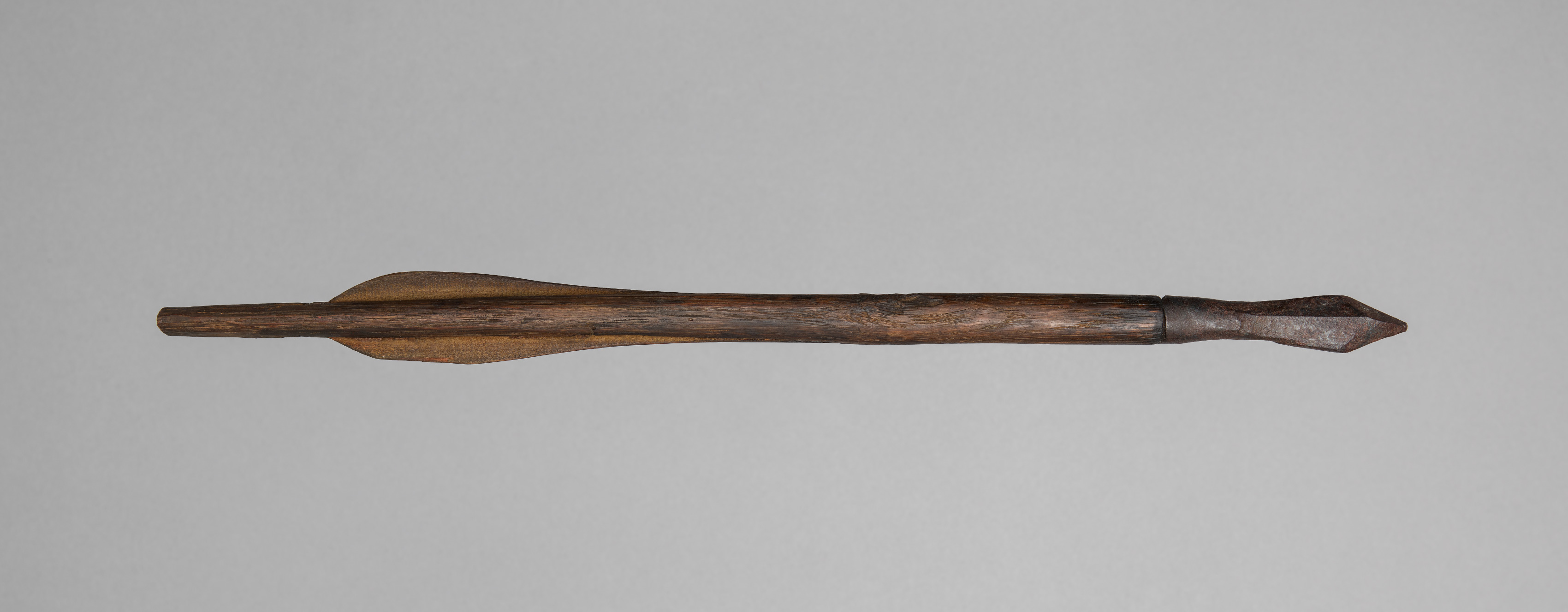 The image depicts Crossbow Bolt by unknown artist. The object is long and thin with a pointed tip. The tip appears to be made of metal and has a dark brown or black color with visible signs of wear or rust. The main body of the object is made of wood and has a darker brown color with visible grain. The wooden section has a slight narrowing in the middle and tapers towards the front. A small metal collar or band encircles the object, located near the middle. Two flat, wide protrusions made of wood are located near the back. The background of the image is a solid gray color.