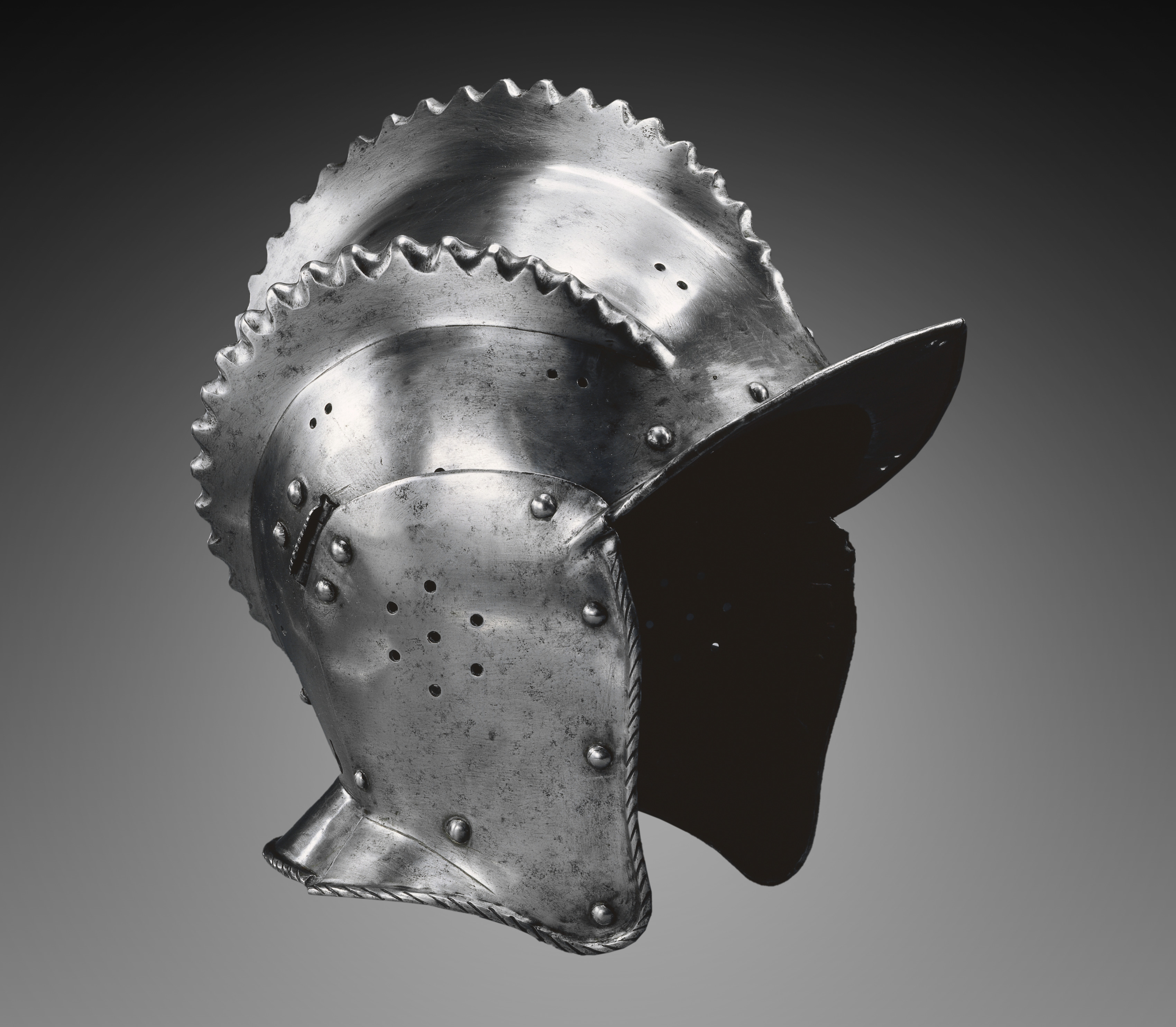 The Triple-Crested Burgonet by an unknown artist is a metal helmet. The helmet has a darkened patina with areas of light reflecting off its surface. The helmet's primary body is made of a single piece of metal, shaped to fit the head, with a pointed top divided into three distinct sections or crests. The crests run from the front to the back of the helmet. The edge of the top section has triangular projections. There are two main sections to the helmet: the top portion covers the top of the head and has ventilation holes, and the face guard which covers the face. The face guard is shaped to protect the face, with a curved shape around the mouth and nose area and a more solid section. The face guard is attached on either side. Rivets are used throughout the helmet to secure various parts. The base of the helmet has a decorative edge. The background of the image is a gradient, dark at the top and light at the bottom.