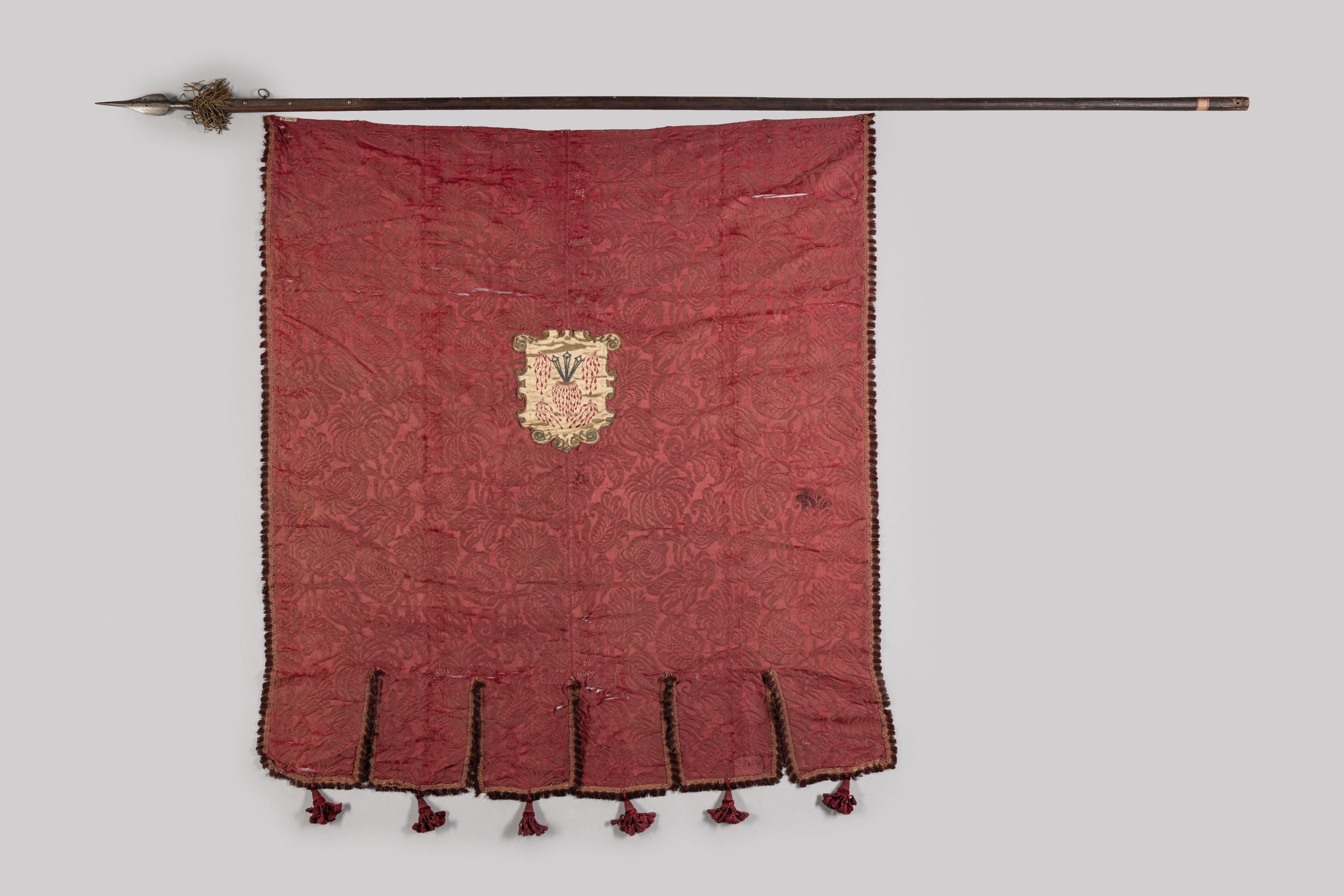 Red banner with a patterned design, featuring a central gold-colored medallion; black and gold trim along edges; six red tassels along bottom edge. A long, thin metal pole with a pointed end and a tuft of material is attached to the top of the banner. The artwork is titled "Banner with Medallions of Christ's Passion" by an unknown artist.
