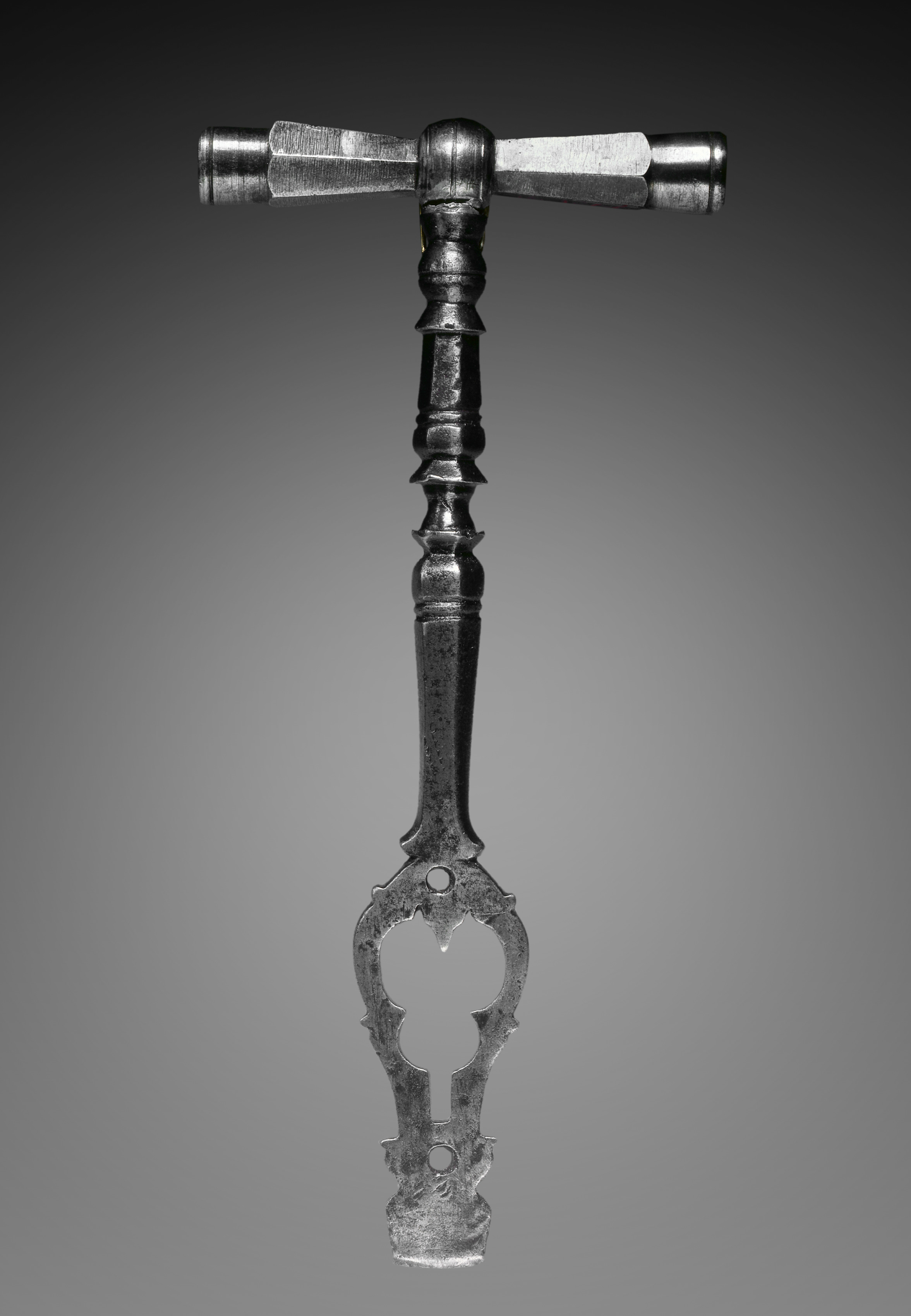 Metal object with a T-shaped top and a handle leading down to a forked end. The T-shaped top has a cylindrical piece on the left and a flat piece on the right. The handle is long and thin with ornate details. The forked end has two prongs with a hole in the center. The background is gray with a darker shade at the top. The object is likely a spanner for a wheel-lock gun.