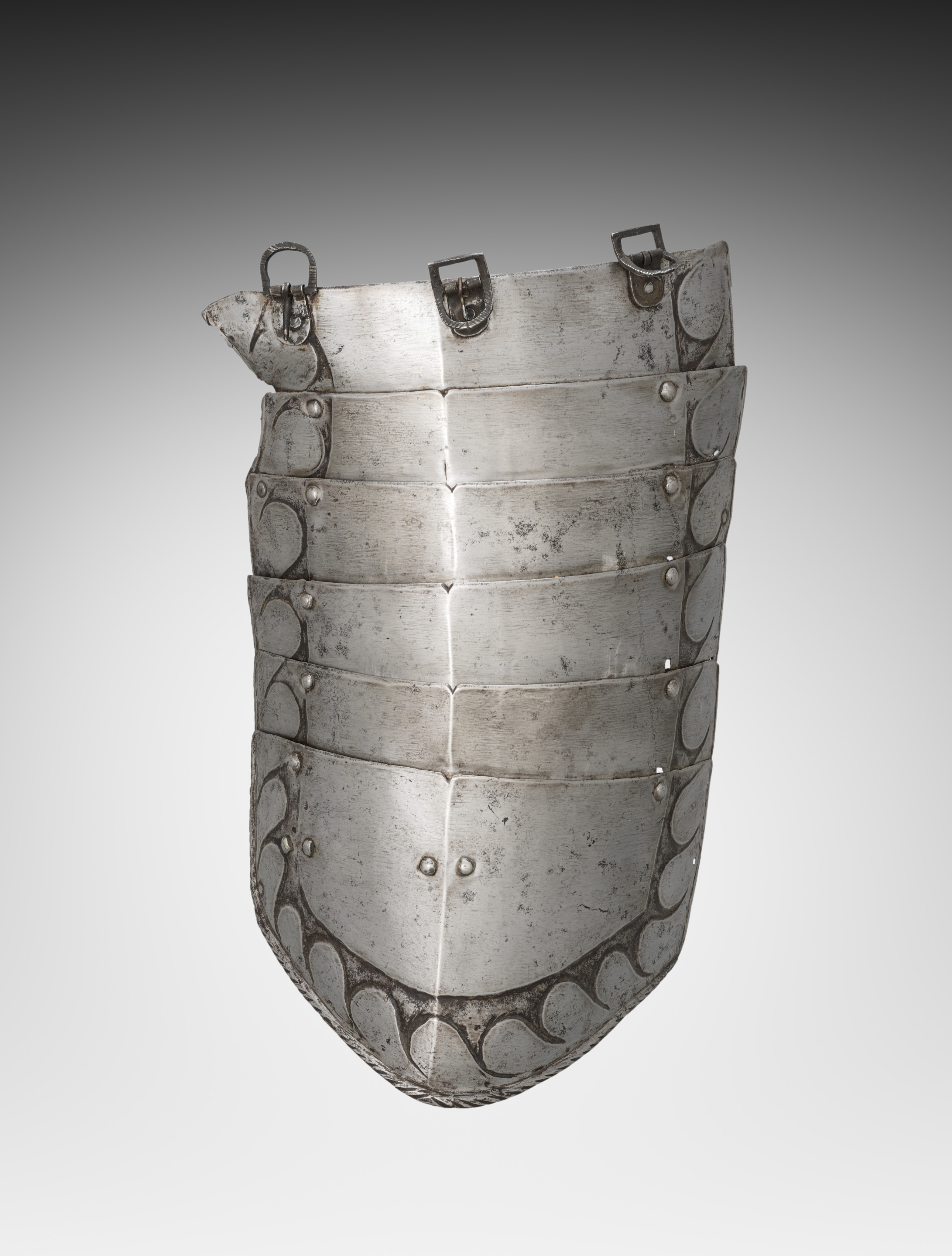 Metal object with a curved shape, resembling a torso shield; made of silver or gray metal, possibly steel; features horizontal bands; four metal loops on top; rivets on sides; background fades from dark to light gray. Tasset (2 of 2) by unknown artist.