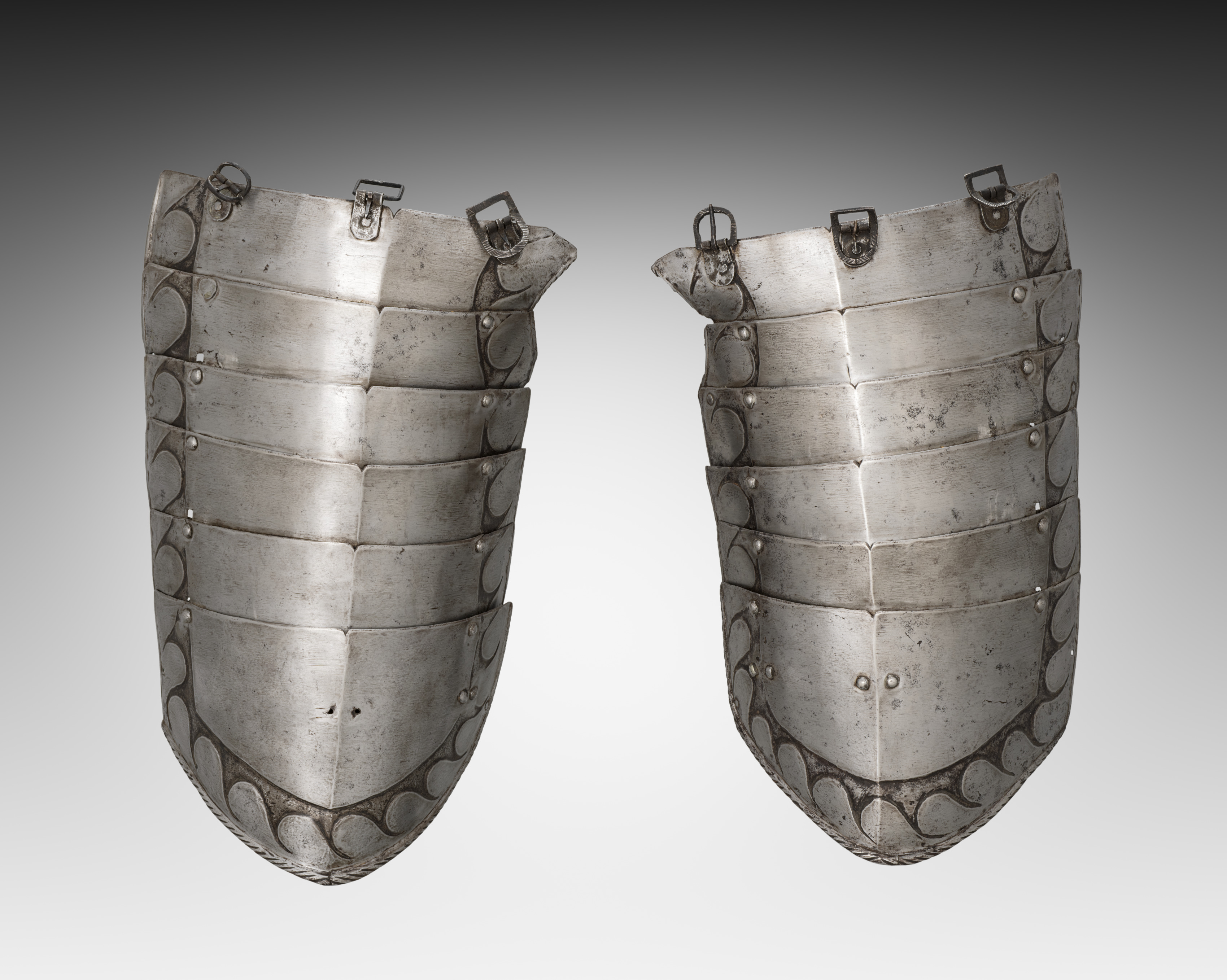 Pair of Tassets by unknown artist. Two silver-colored, metal tassets, side by side, against a gray gradient background that is darker at the top and lighter at the bottom. The tassets are shaped like elongated, upside-down teardrops with the pointed ends facing downwards. Each tasset consists of six horizontal, overlapping plates. There are metal loops and rivets along the edges and throughout. The top of each tasset is slightly curved and has two small metal handles or clasps. The bottom edge of each tasset features a decorative border of half-circles. The metal has a worn, scratched appearance. The tassets are symmetrical, with the one on the right being a mirror image of the one on the left.