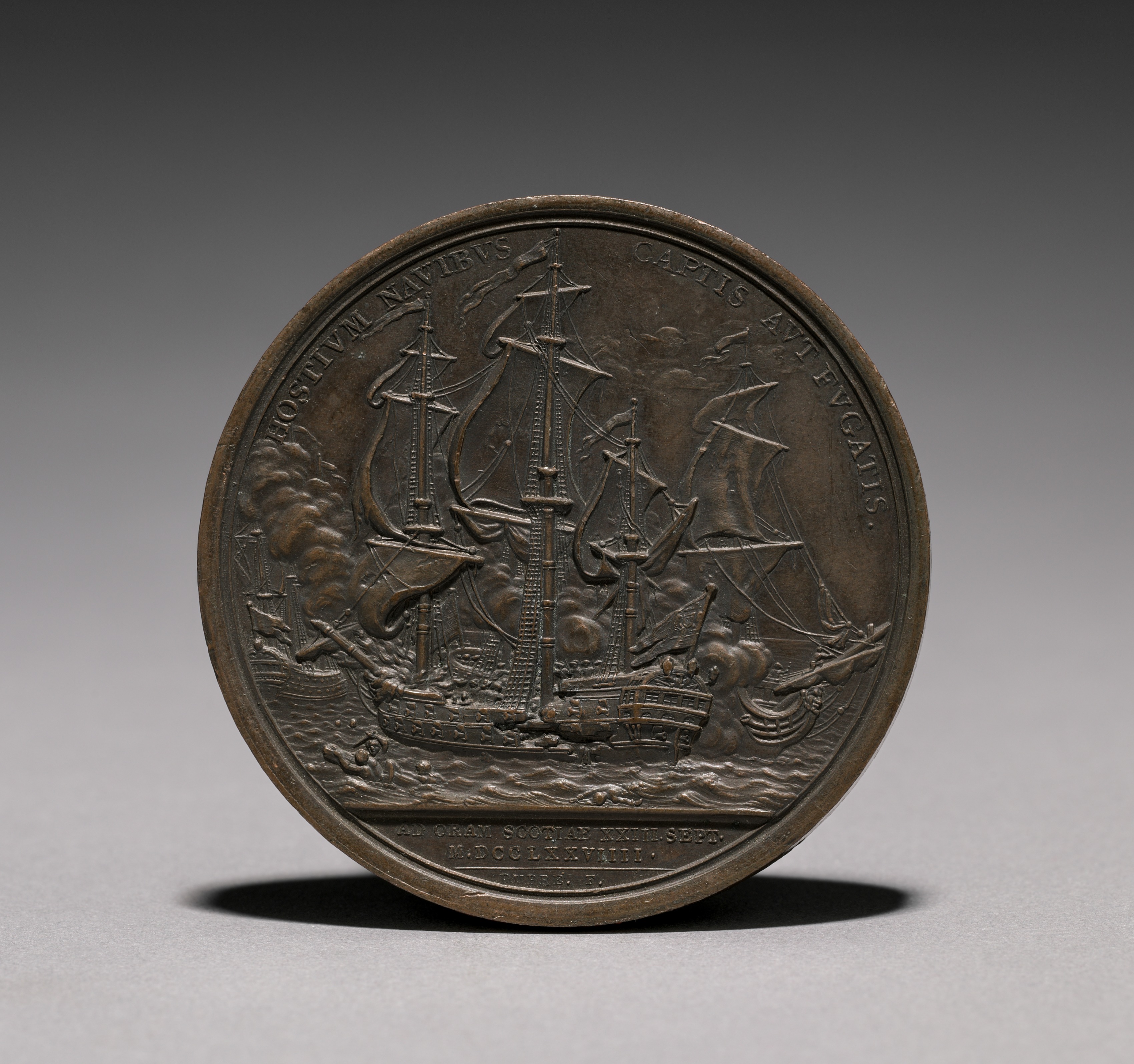Bronze-colored medal with dark patina. Ship with three masts on water with another ship catching fire on left. Text on top edge reads "HOSTIVM NAVIBVS CAPITIS AVT EVADIS". Text on bottom edge reads "ORAN SCOQUAE XXXI. SEPT. MDCCXCIV".