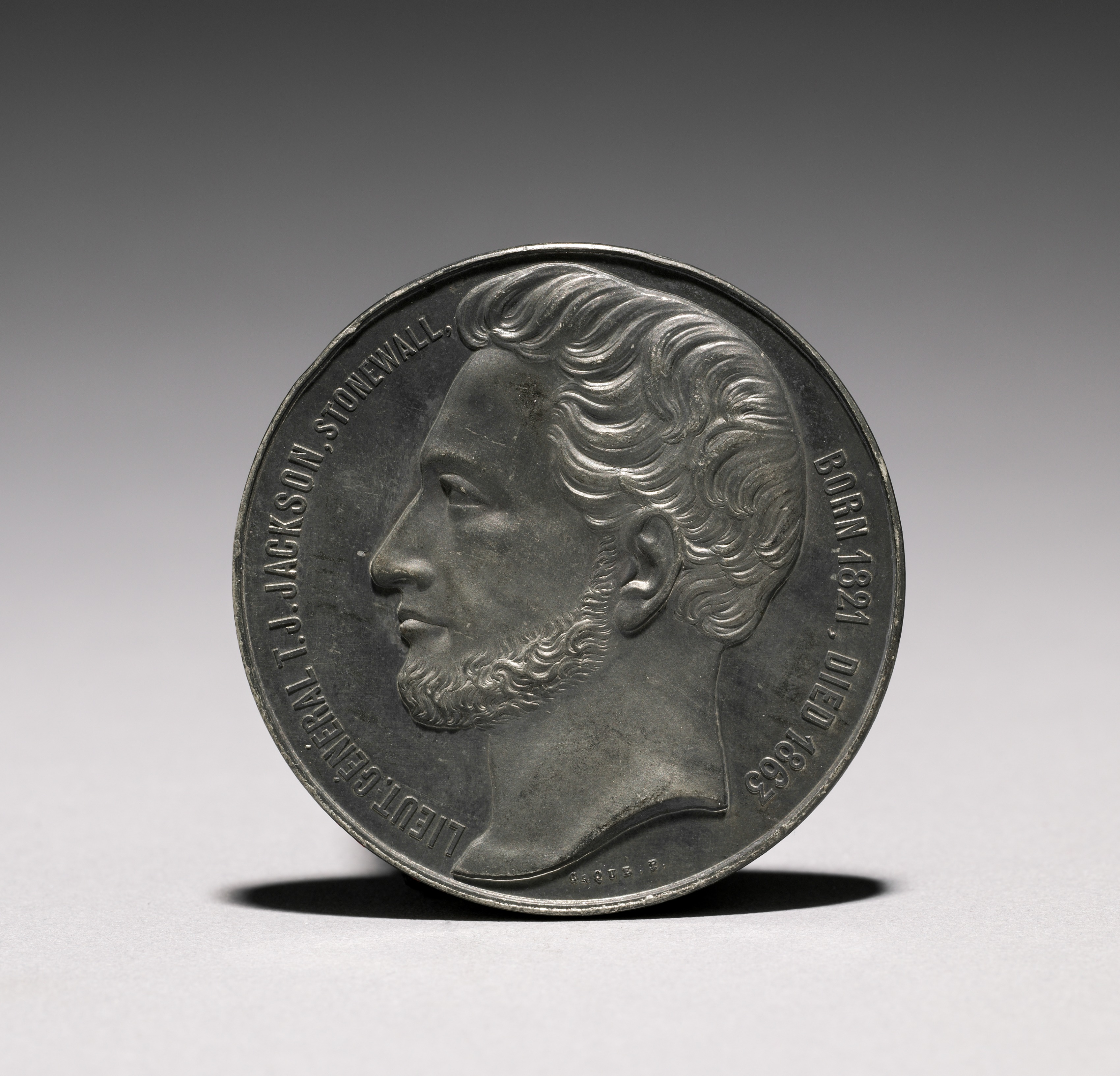 Medal with a raised profile portrait of a man with short, wavy hair and a beard. The man's head and upper shoulders are shown, facing left. The medal's edge is raised. The text on the medal reads "LIEUTENANT GENERAL T.J. JACKSON, STONEWALL" at the top and "BORN 1824. DIED 1863" to the right of the man's head. Small engraved text near the bottom reads "Caqué". The medal's background is a gray gradient transitioning from dark to light. The medal appears to be made of a dark metal. It casts a shadow on a light surface.