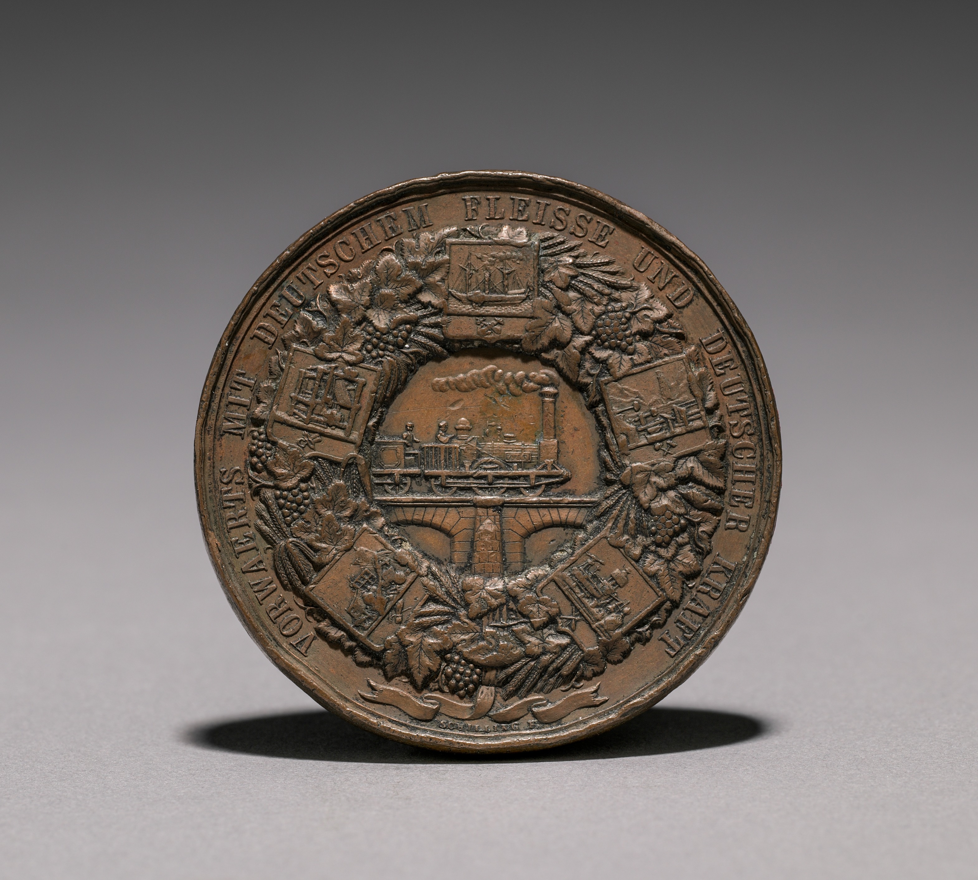 Bronze-colored medal, circular, raised edges, slightly worn. Text along top edge reads "DEUTSCHEM FLEISSE UND DEUTSCHER". Text along bottom edge reads "INDUSTRIE". Reverse side of medal features a train on tracks, within archway formed by crossed flags and surrounded by laurel and oak leaves, wheat, and grapes. Emblem at top center appears to have three figures. Small buildings on either side. Background fades from dark gray to light gray. Medal casting shadow on surface below.